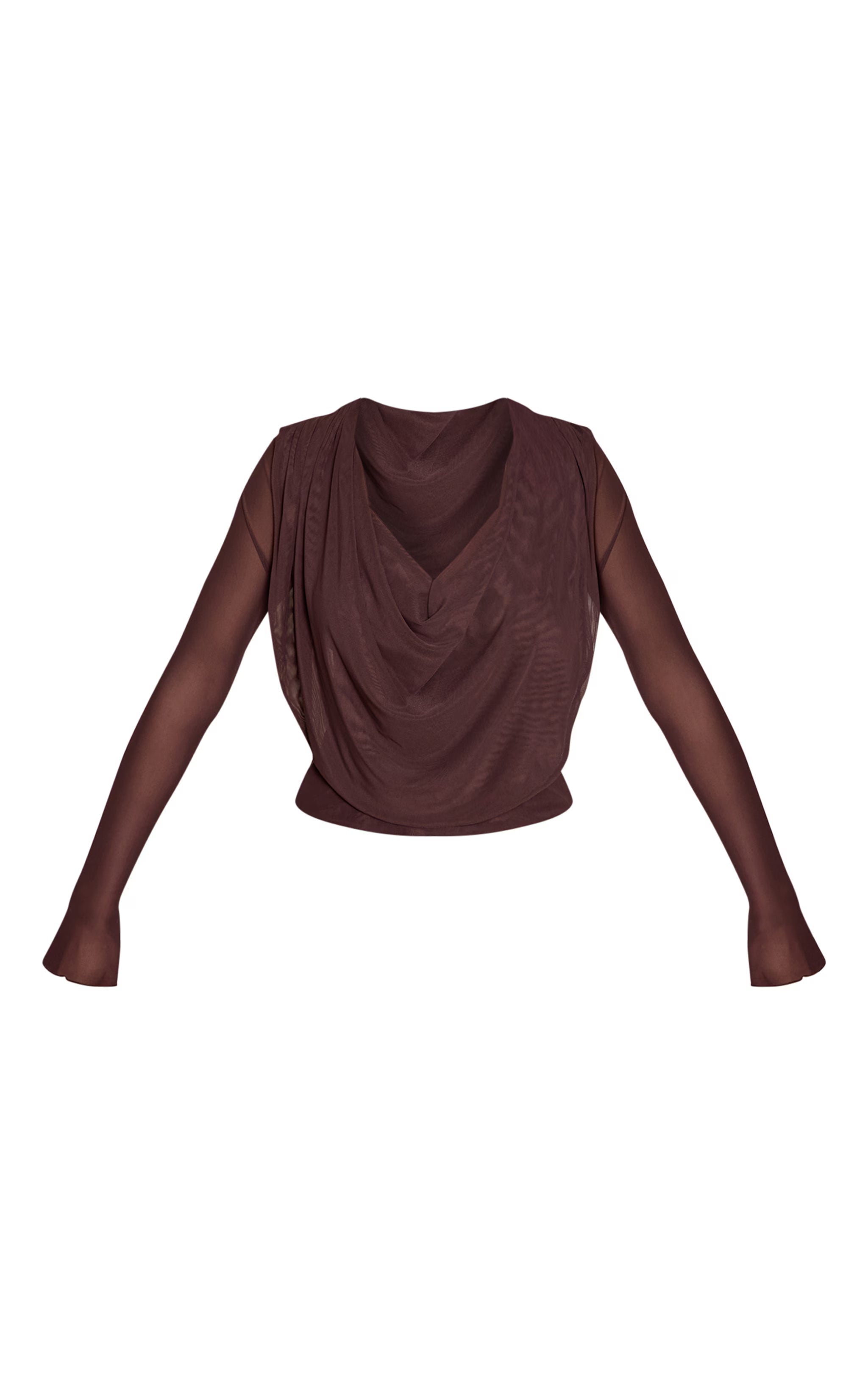 The chocolate mesh cowl long sleeve top offers a knowing blend of refined transparency and sophisticated drape, defining your evening allure with effortless grace. This confident piece features a deep cowl neckline that elegantly frames the decolletage, complemented by long, subtly sheer sleeves and a contemporary cropped hem. Elevate the look with high-waisted tailored pants or a sleek midi skirt, grounding the ensemble with sharp strappy heels and a subtle gold ring, ensuring an undeniably chic presence that owns the moment.