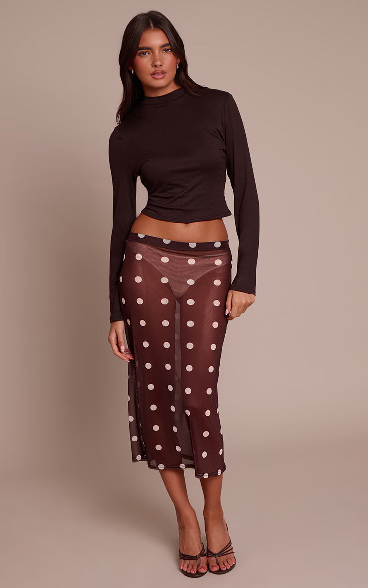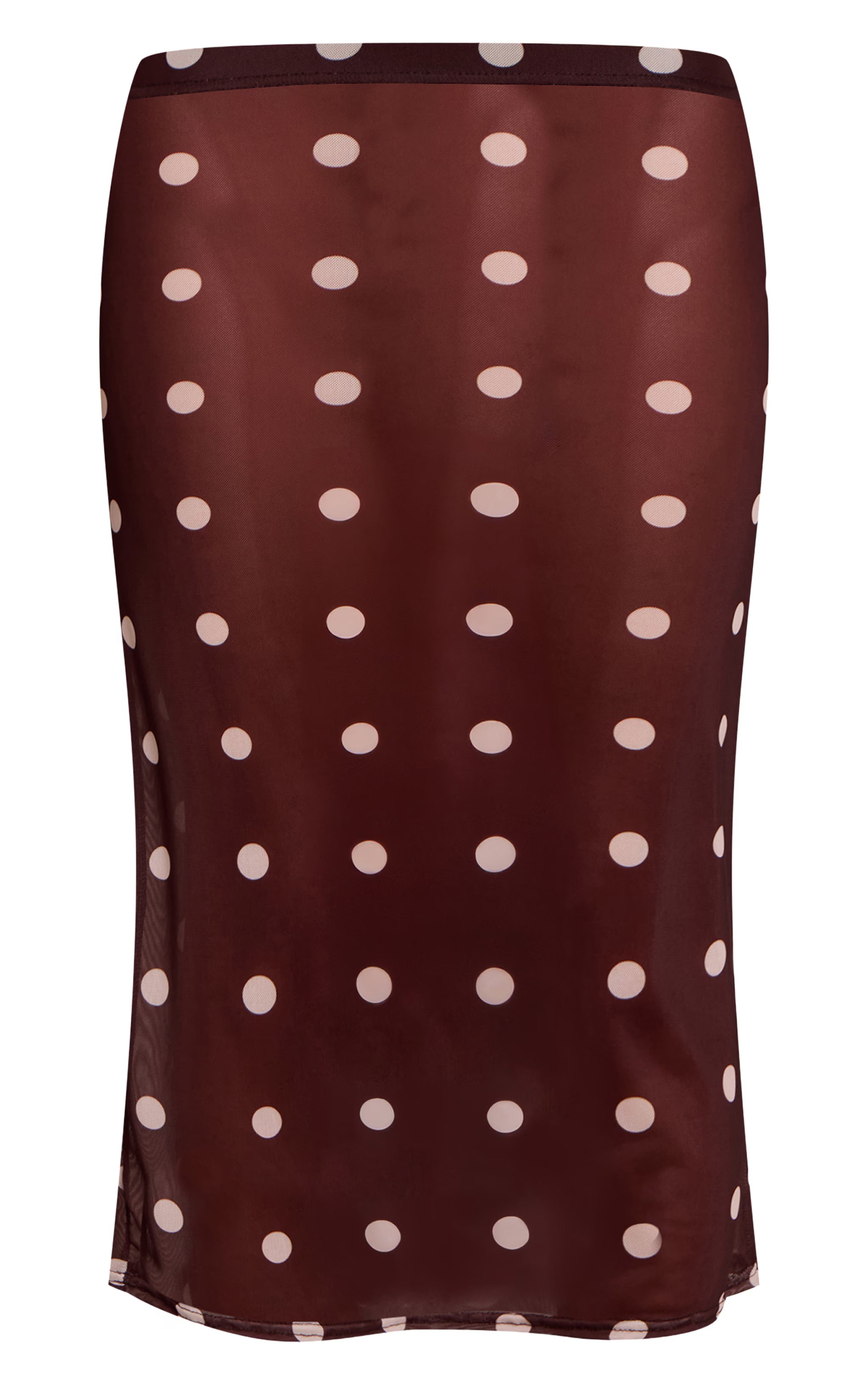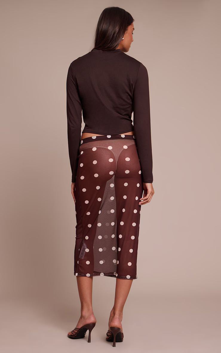 Embrace sheer artistry for your everyday rotation. The chocolate mesh polka dot midi skirt presents a truly distinctive design, showcasing a sophisticated brown hue with an artful polka dot pattern across its transparent midi length. Its effortless silhouette makes a confident statement, offering a modern edge to any day look. Pair this versatile skirt with a simple cami or a relaxed sweater, then complete your assured aesthetic with some sleek black kitten heels and delicate gold jewelry for an undeniably chic finish.