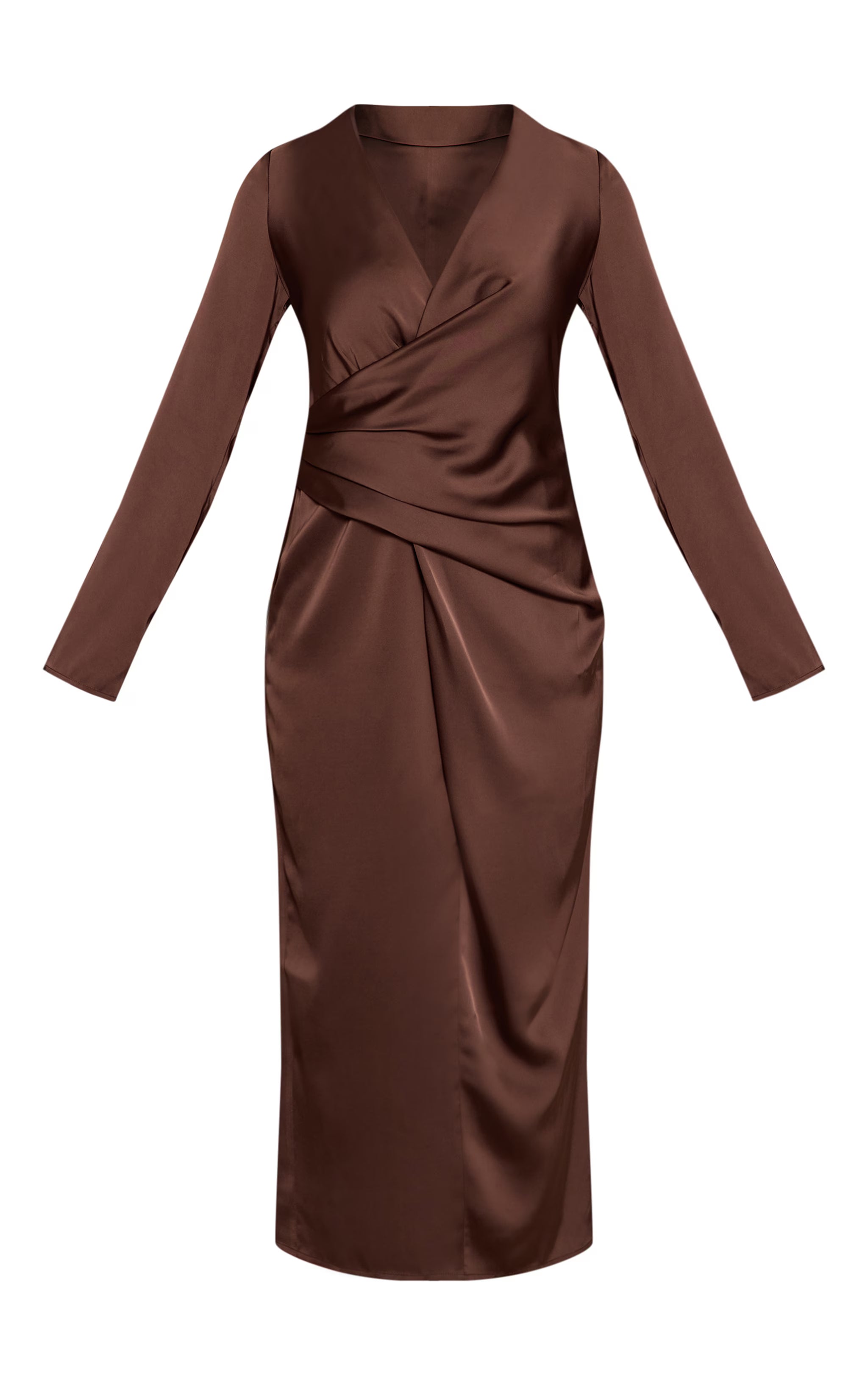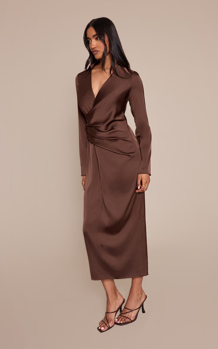 Choose timeless glamour with the chocolate satin ruched detail long sleeve midaxi dress. Cut from chocolate satin with artful ruching through the waist and a fluid midaxi hem, it flatters from every angle. Style with ankle-strap heels and a bejewelled clutch for event-ready finesse.