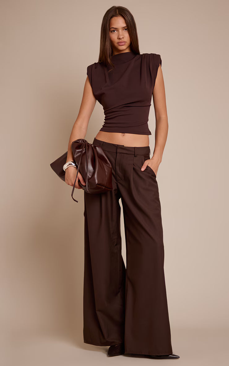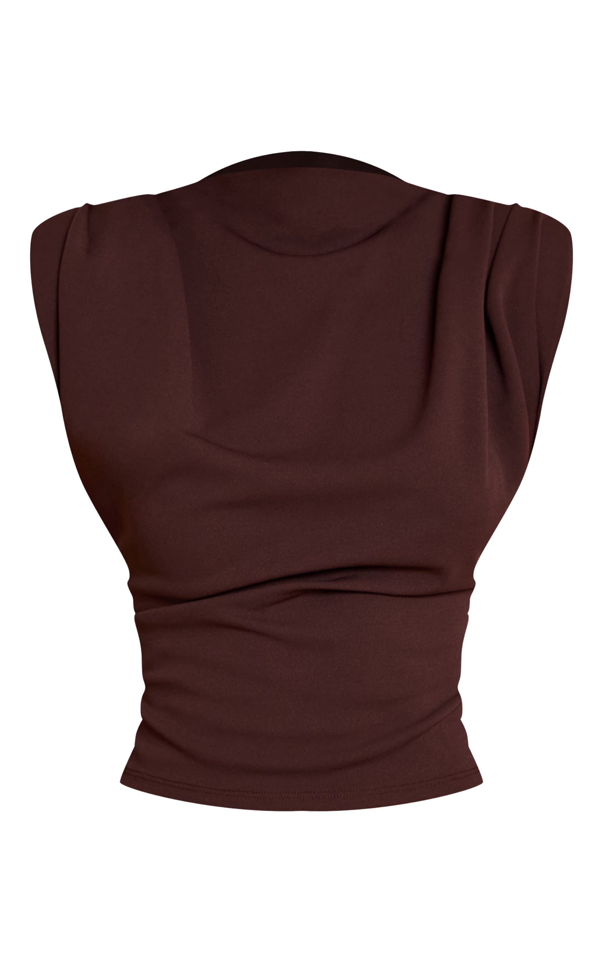 Make every entrance count in this distinct design. The chocolate shoulder pad pleated boat neck top redefines sleek evening wear with its high, boat neckline and commanding pleated shoulder detail. Designed to crop elegantly at the waist, its tailored lines are subtly gathered to create a flattering finish. Team it with high-waisted tailored pants for a streamlined look, finishing with delicate gold heels and a statement gold ring to capture that knowing edge.