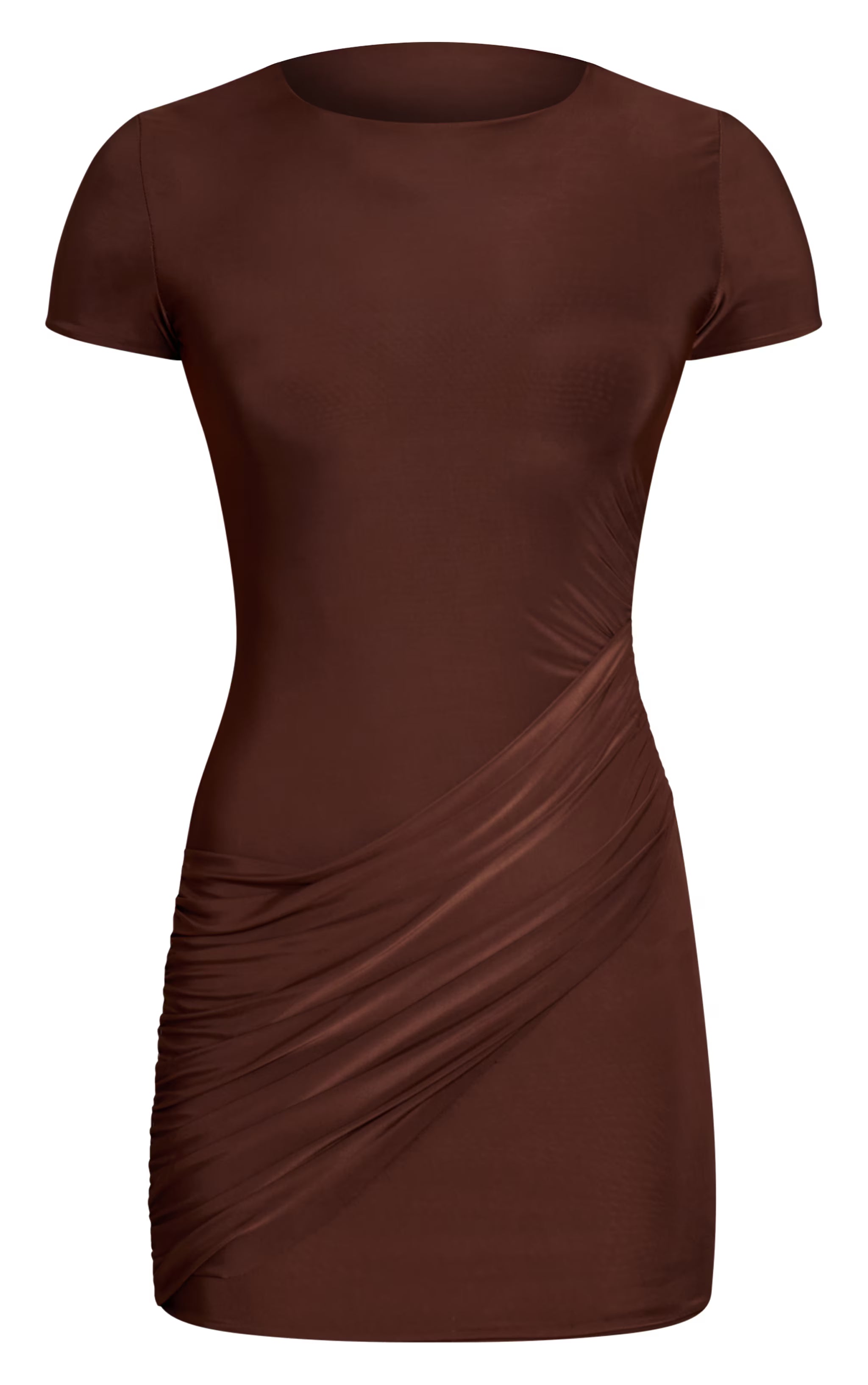 Sculpted for impact, this is sophisticated evening styling done right. The chocolate slinky drape cut out mini dress redefines the classic bodycon with its artful draping and contemporary appeal. Featuring a clean boat neckline and sleek short sleeves, the design centres on an innovative side drape that sculpts the form and introduces an intriguing cut-out detail, creating a powerful silhouette. Command attention by pairing this piece with sharp heeled mules and a contrasting black bag. Perfect for making an unforgettable entrance, this dress ensures a knowing, confident look.