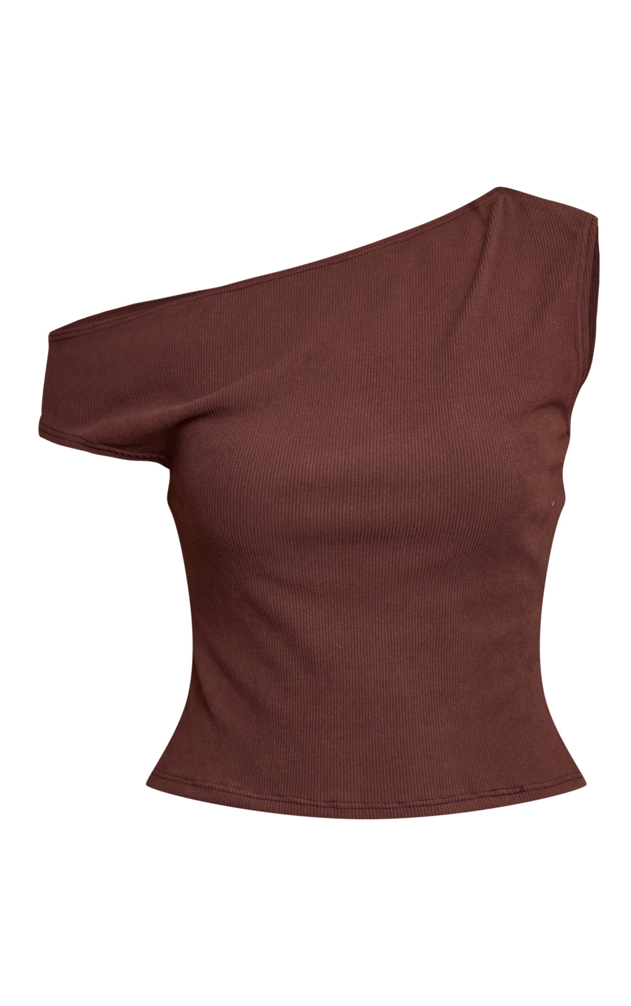 Effortless edge defines your next daytime look. The chocolate soft brushed rib asymmetric neckline long top truly owns its name, presenting a distinctive off-shoulder cut on one side that seamlessly transitions into a subtle cap sleeve on the other, creating a unique, confident silhouette. Its cropped length offers a modern feel, perfect for pairing with high-waisted bottoms. Style this essential top with relaxed-fit pants and a pair of brown cowboy boots for an effortlessly cool ensemble. Complete the look with a sleek black bag, mastering a sophisticated yet laid-back vibe.