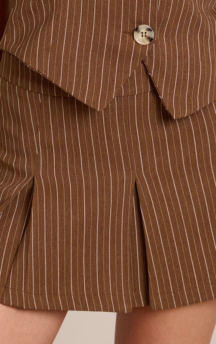 The chocolate tailored woven herringbone mini pleated skirt brings a preppy yet polished aesthetic. Its pleated design adds movement, while the herringbone texture feels classic. Pair with the matching halterneck top for a modern tailored two piece set or a chunky knit for casual charm.
