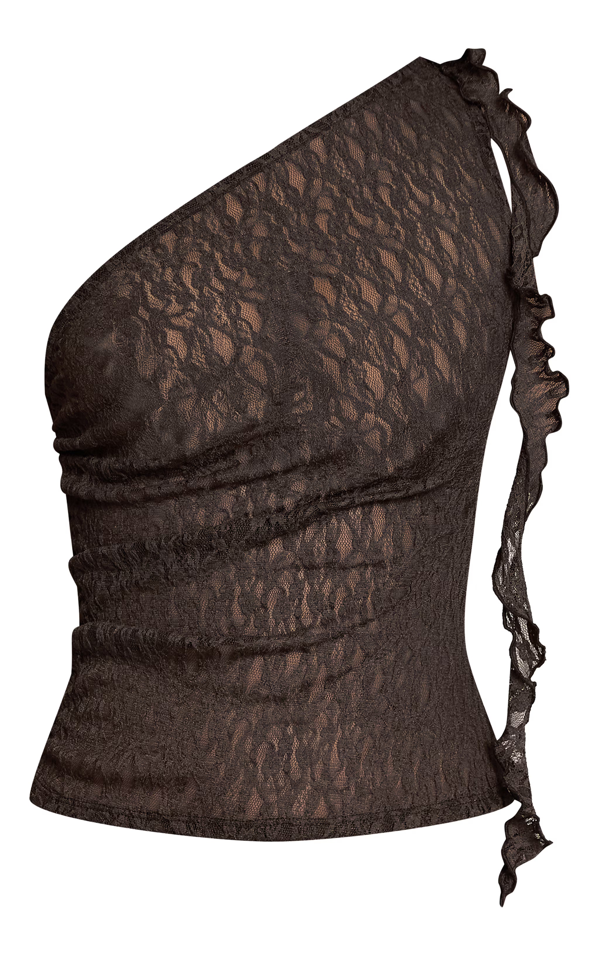 Redefine evening wear with an artful twist. The chocolate textured lace frill drape detail asymmetric top makes a confident statement, presenting a chic one-shoulder neckline crafted from intricate chocolate lace, elegantly framed by delicate frill drape detailing. Pair this striking cami with sleek tailored pants and sophisticated mule heels for an elevated ensemble, completing your aesthetic with sleek gold bracelets. This piece ensures your evening look is undeniably artful and self-assured.