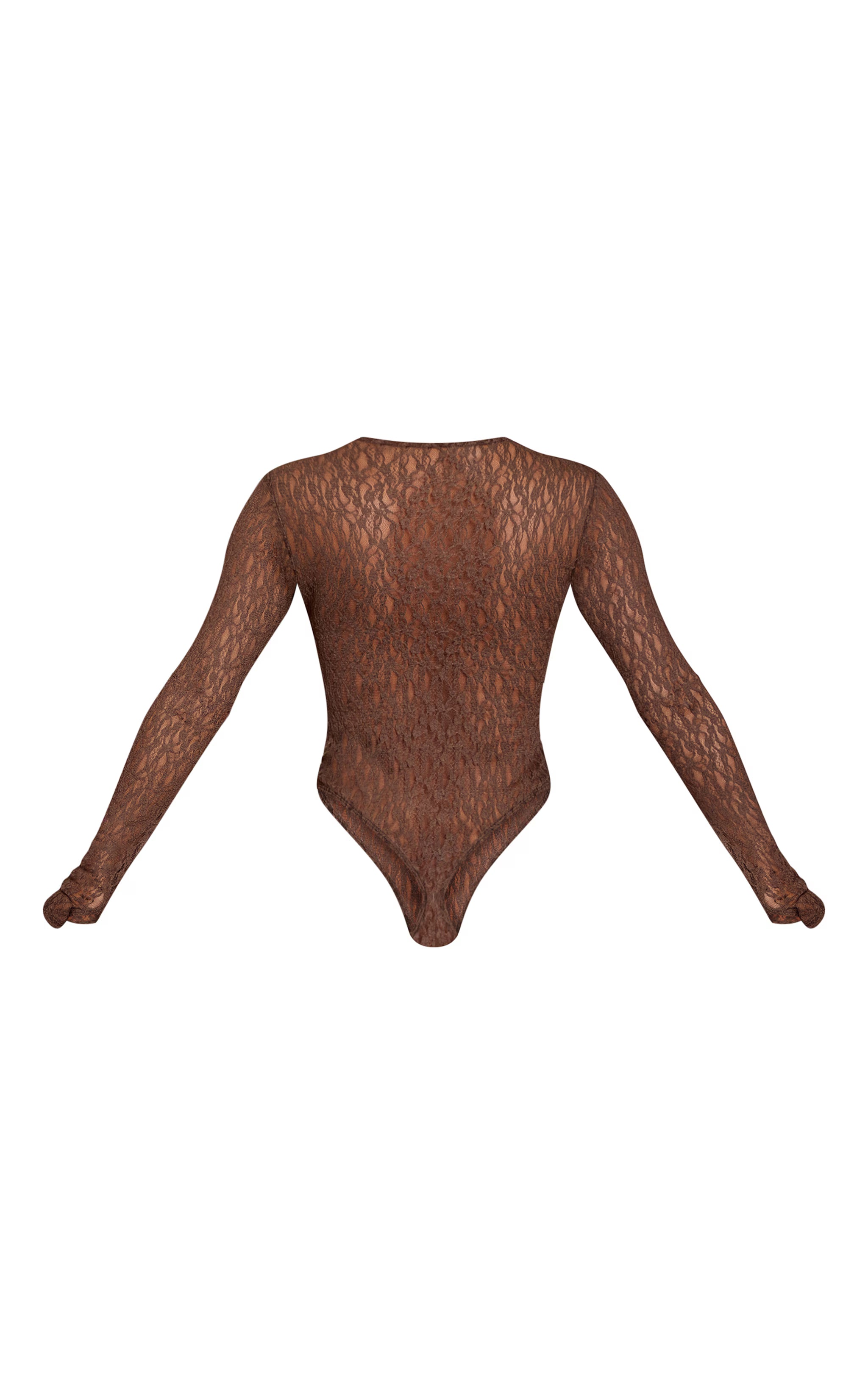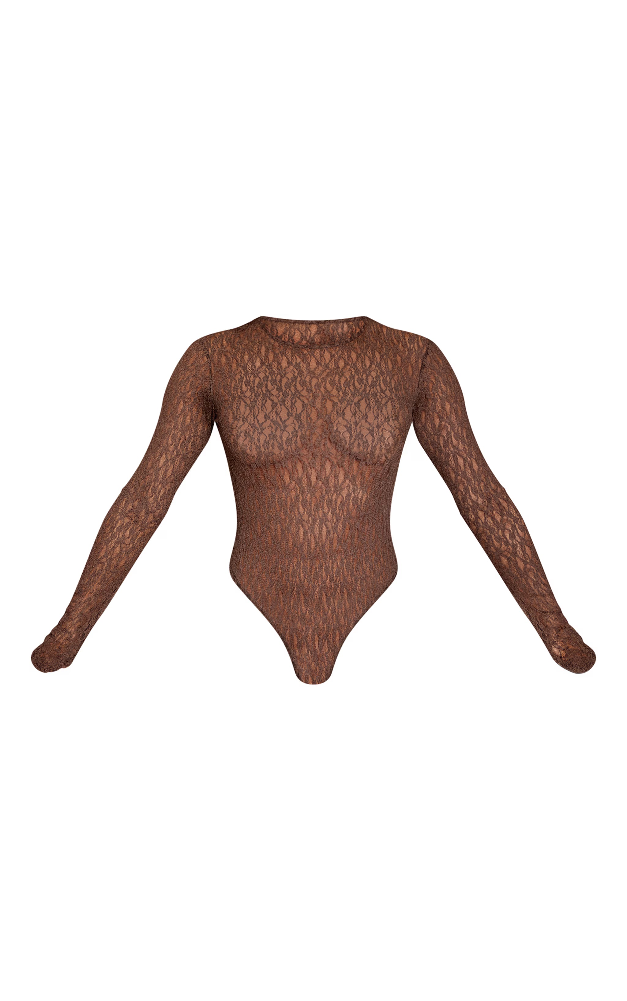 Unleash an undeniable confidence with an artful base, as the chocolate textured sheer lace long sleeve bodysuit instantly elevates your evening repertoire. Its intricate sheer lace pattern offers a knowing transparency, complemented by a refined round neckline and sleek long sleeves featuring artful thumbhole detailing. This piece ensures a streamlined silhouette, forming a captivating foundation for any evening look. Pair this confident piece with high-waisted tailored pants, grounding your look with sleek kitten heels and adding a touch of gold bracelets for an undeniable, polished finish.