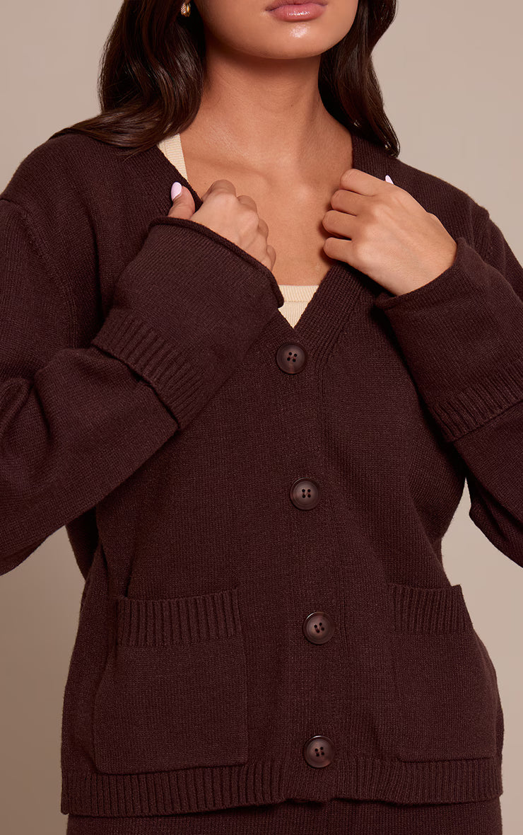 The chocolate turn back cuff cardigan is a cozy yet polished wardrobe staple. Crafted from a soft knit, it features turn-back cuffs that add a relaxed, effortless detail. Layer over a cami and jeans for a casual daytime look or over a slip dress for a soft, romantic feel. It’s the perfect blend of comfort and sophistication.