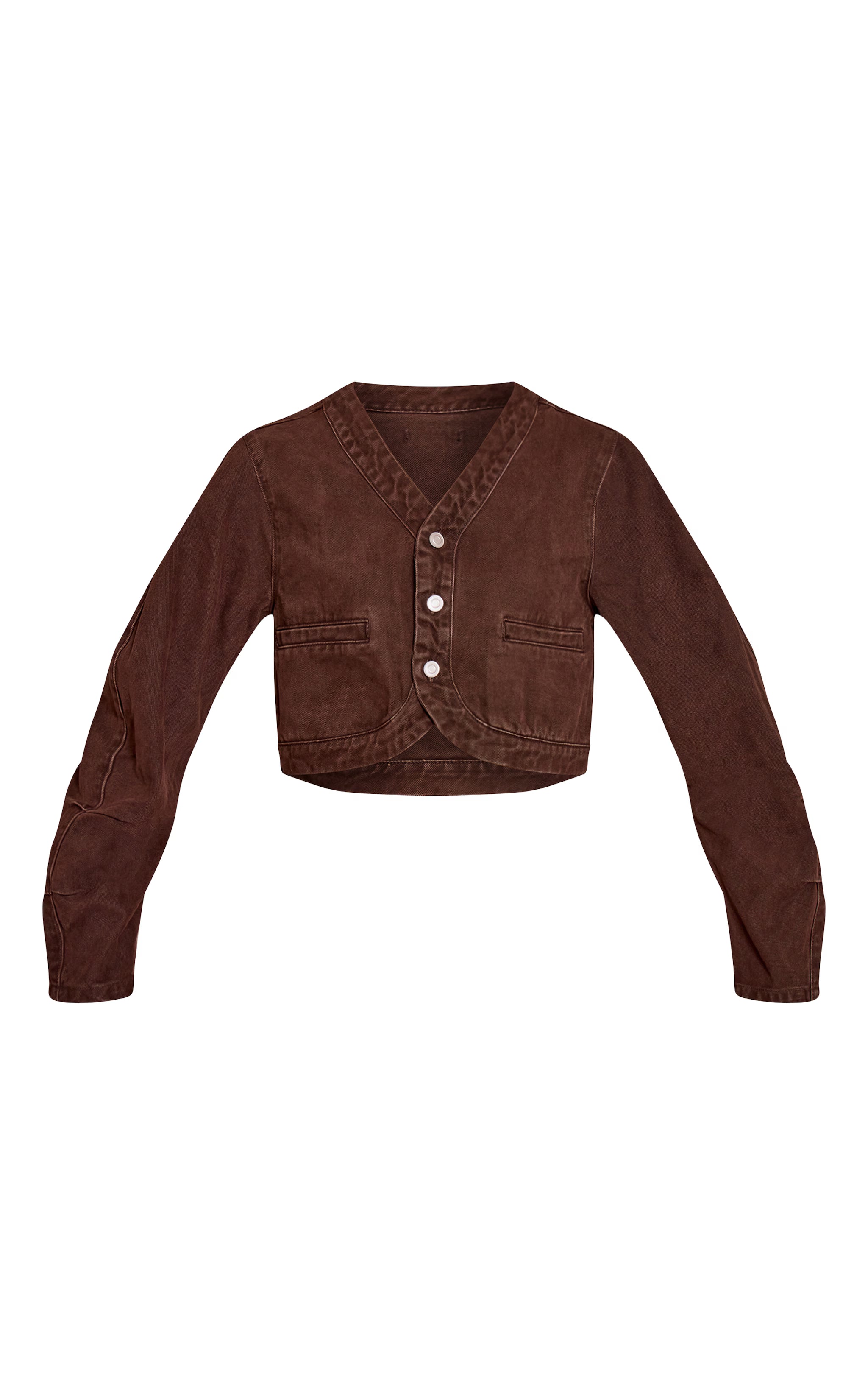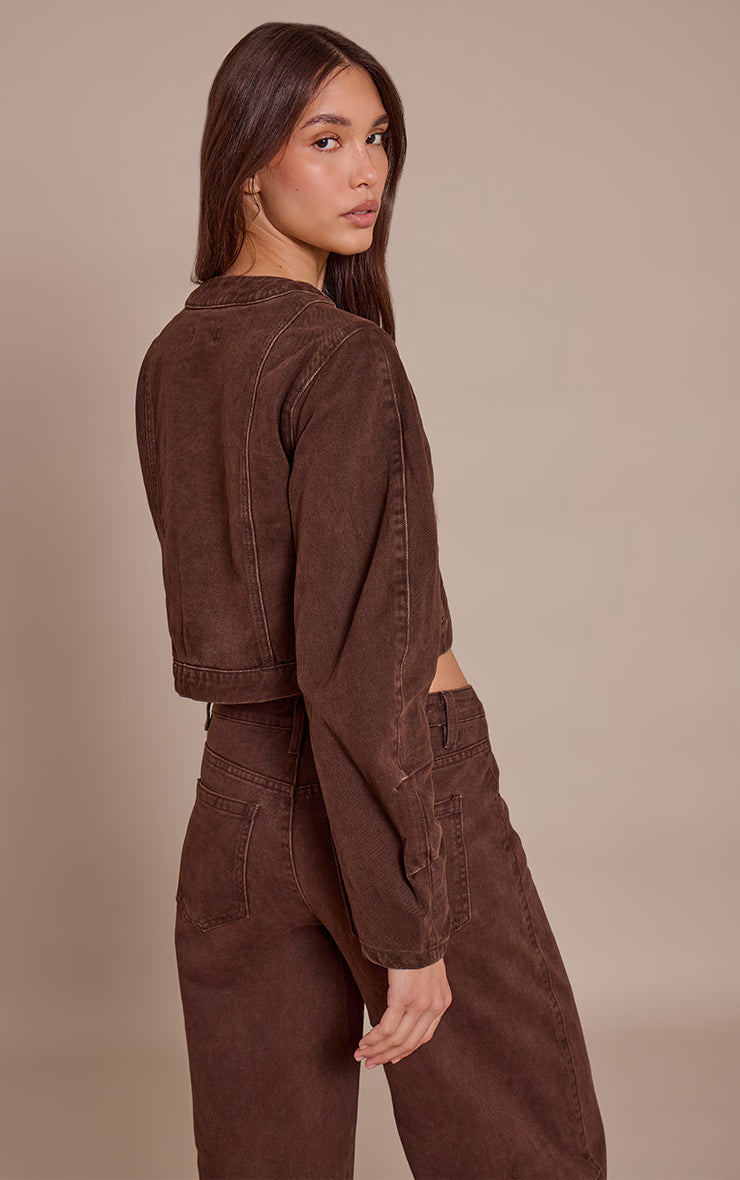 Make a clear statement with denim that transcends the expected. The chocolate v neck curved hem cropped denim jacket unveils a confident silhouette in a rich chocolate hue, featuring a pronounced V-neckline and a series of clean white buttons down the front. Its contemporary cropped length and distinctive curved hem sculpt an artful profile, making it a definitive piece for refined daywear. Pair it with the coordinating wide-leg pants for a cohesive two piece set, then elevate the entire look with chic nude heels and a minimalist gold ring, asserting an understanding of effortless style.