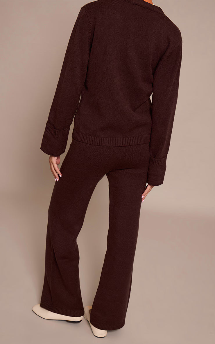 Keep it cosy and chic with the chocolate wide leg knit pant. Crafted from soft knit fabric in a rich chocolate hue, these wide-leg pants feature a comfortable fit and timeless design. Style with a coordinating knit top and sneakers for a relaxed yet elevated off-duty look.