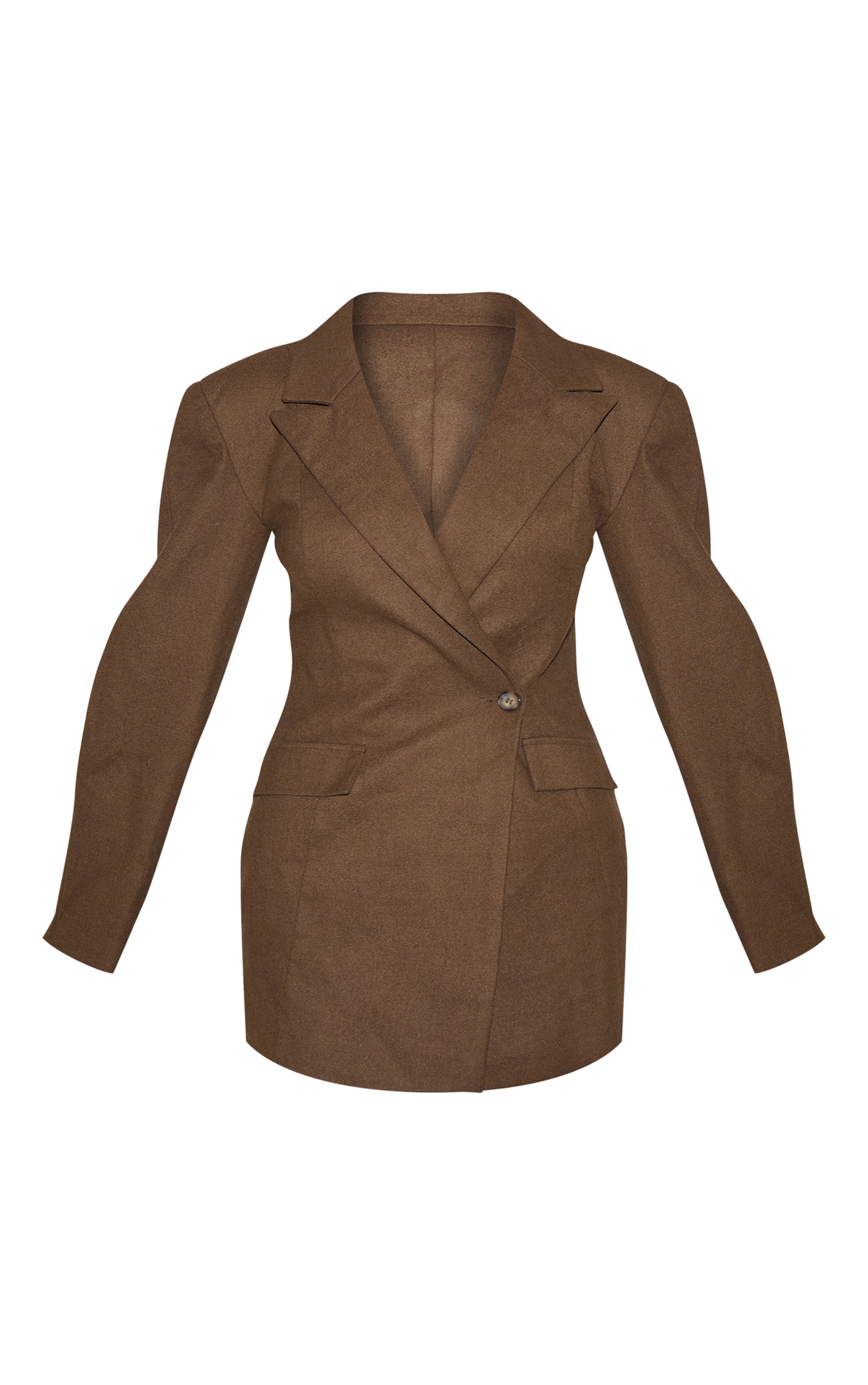 The chocolate wool look structured blazer dress combines sharp tailoring with feminine elegance. Featuring a rich brown wool look fabric, fitted waist, and button detailing, it transitions effortlessly from day to night. Style with knee-high boots or heels for a power-dressing moment.