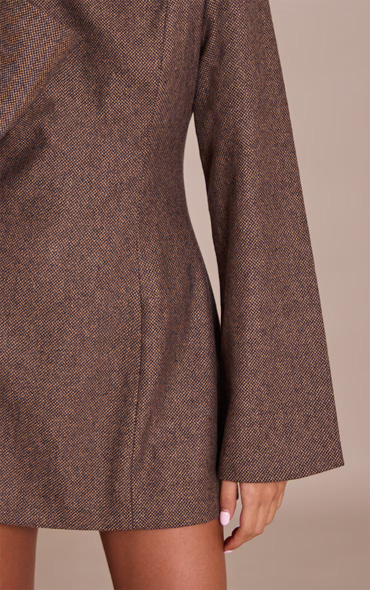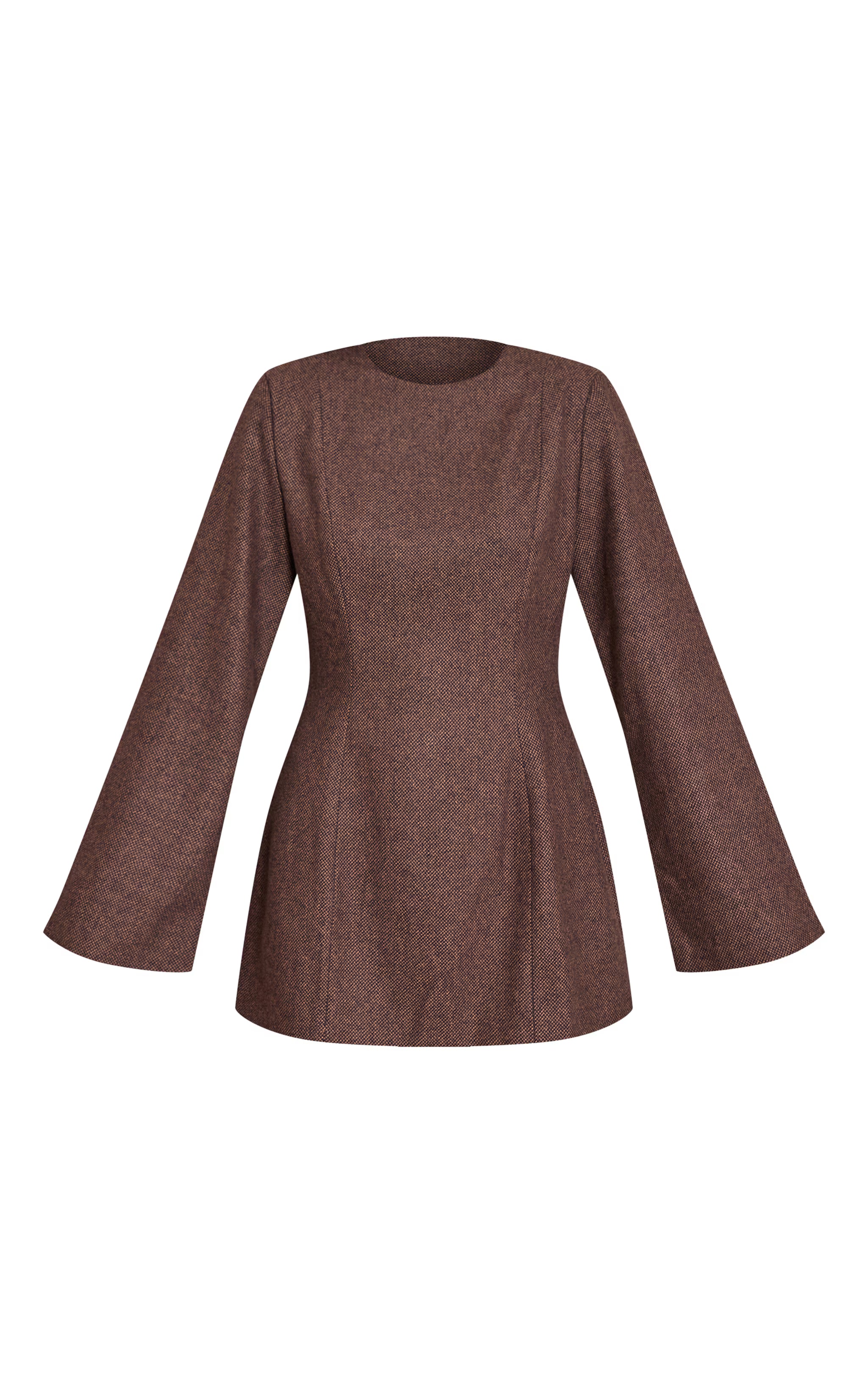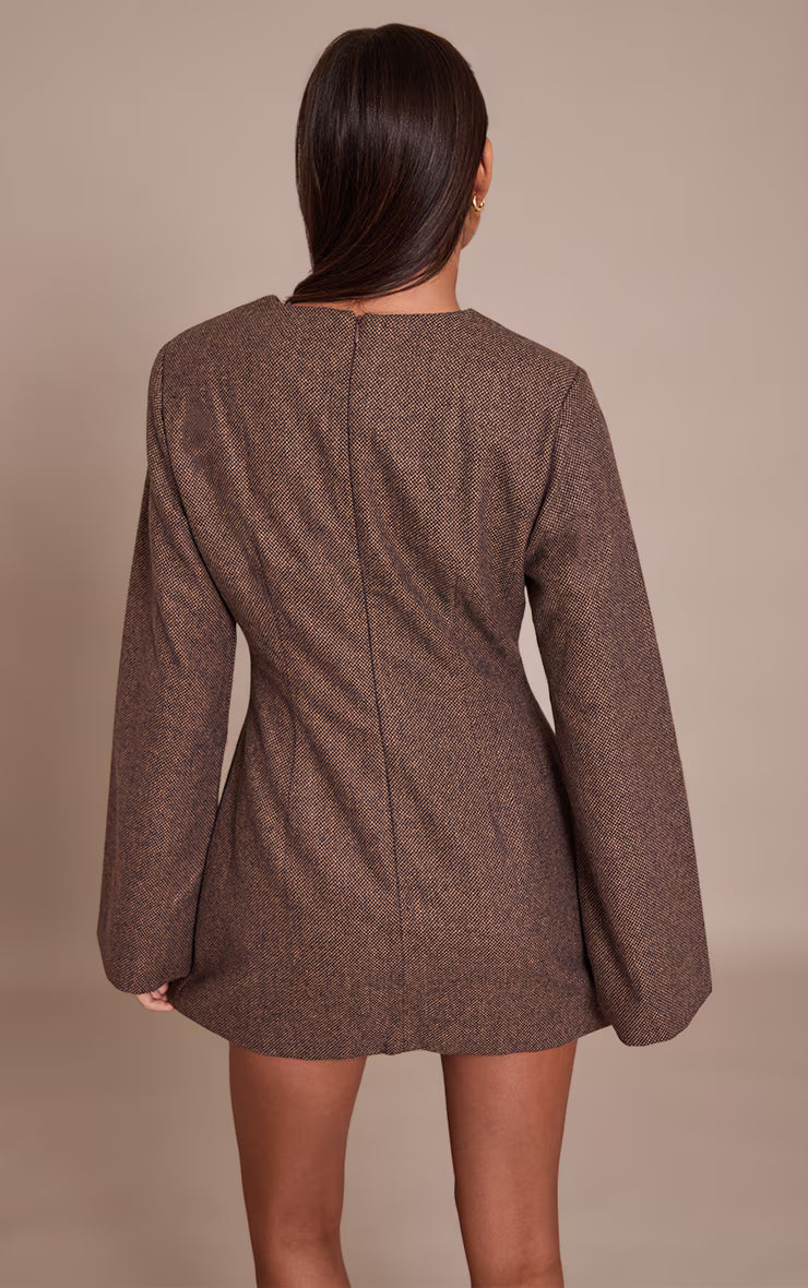 Channel effortless polish for day with a piece that works as hard as you do; the chocolate wool look structured shift dress redefines your wardrobe essentials. Its rich chocolate 'wool look' texture offers a refined visual, complemented by a sophisticated round neckline and long, subtly flared sleeves. The precisely placed seams create a confident, structured silhouette, subtly cinching at the waist before falling to a chic mini length. Complete this versatile piece for any day agenda with sleek black heels and a pair of delicate gold earrings, ensuring a confident, pulled-together aesthetic.