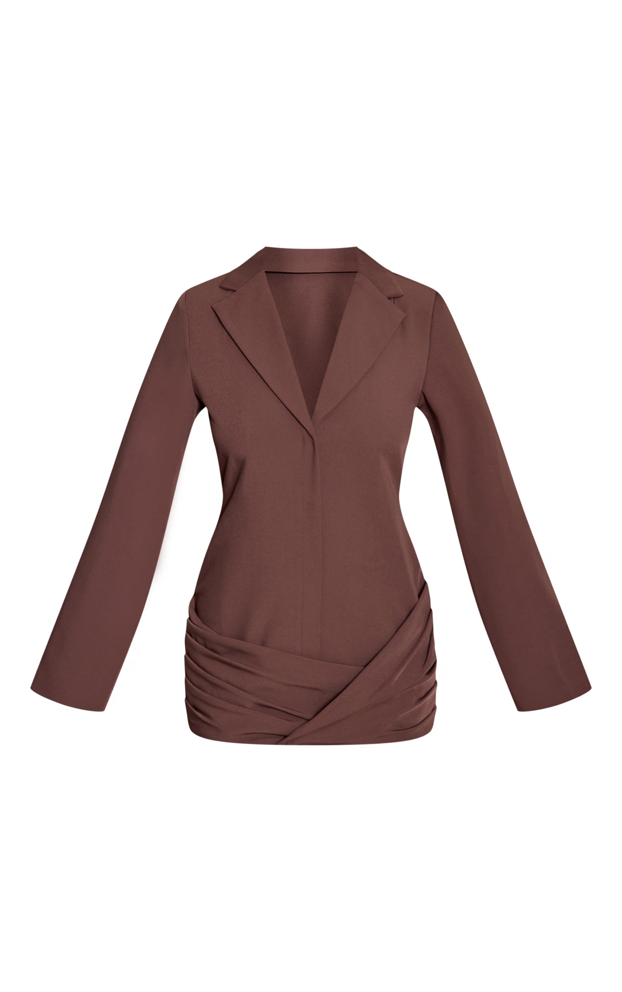 Own the room in the chocolate woven wrap hem blazer dress. Tailored from chocolate woven suiting with a wrap hem and notch lapels, it sculpts a sleek, leg-lengthening silhouette. Pair with slingback heels and a metallic clutch for polished occasionwear.