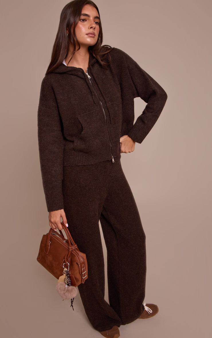 Master the art of elevated comfort for your everyday agenda. The chocolate zip through knitted hoodie brings a knowing edge to knitwear with its relaxed, yet refined silhouette, classic hood, and practical full zip fastening. This essential piece works seamlessly for day; pair it with the coordinating knitted pants for a tonal ensemble, or style with tailored black pants and sleek knee high boots for a directional daytime look. Complete your vibe with understated accessories, affirming your command of effortless style.