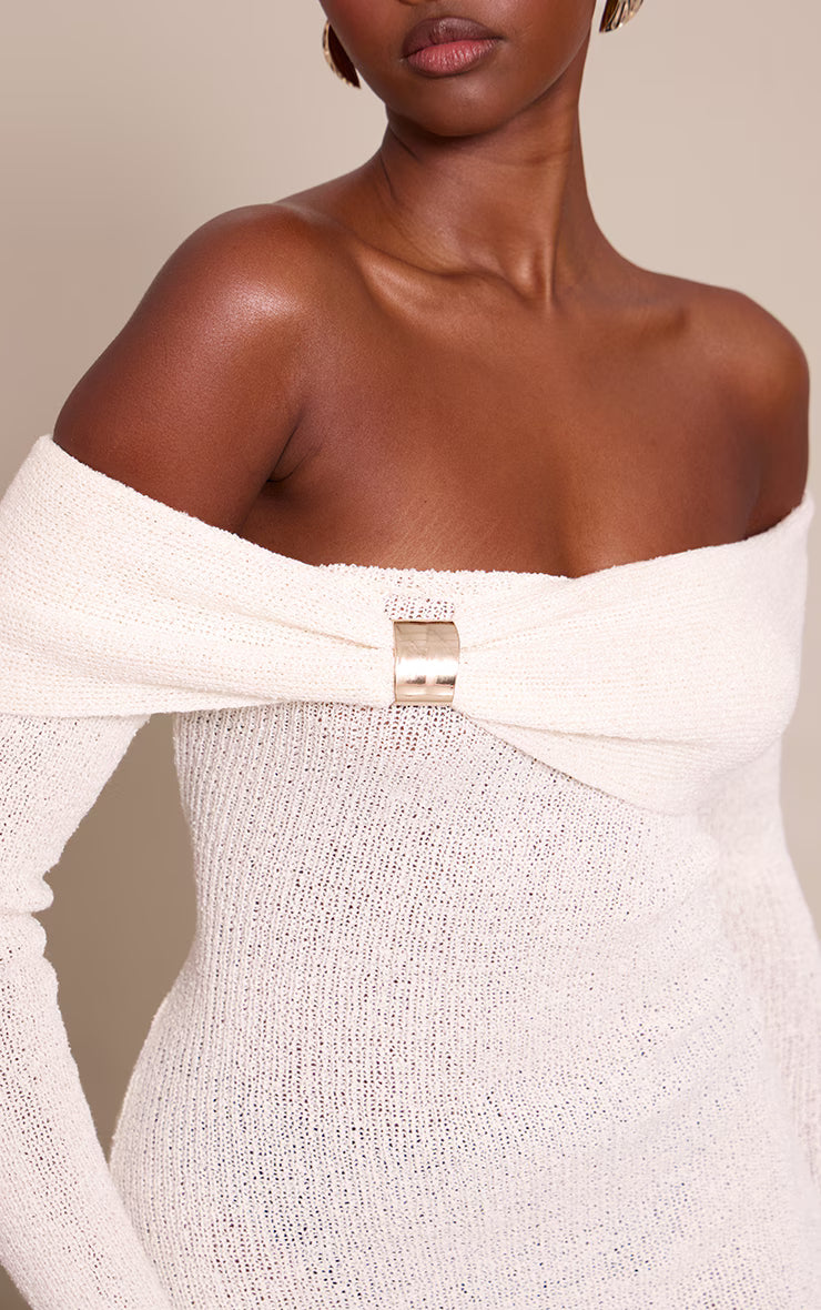 Own the evening with a confident design that seamlessly blends sophistication and edge. This cream bardot trim detail knitted dress presents an artful off-shoulder neckline, gracefully framing the décolletage, while its long sleeves extend to a sleek mini cut. The subtle metallic bar detail at the bust offers an unexpected, refined accent to the knitted silhouette. Complement this essential with sharp gold heels and a minimalist black bag for a polished after-dark ensemble. A curated pair of earrings will complete your look, ensuring an undeniable presence.