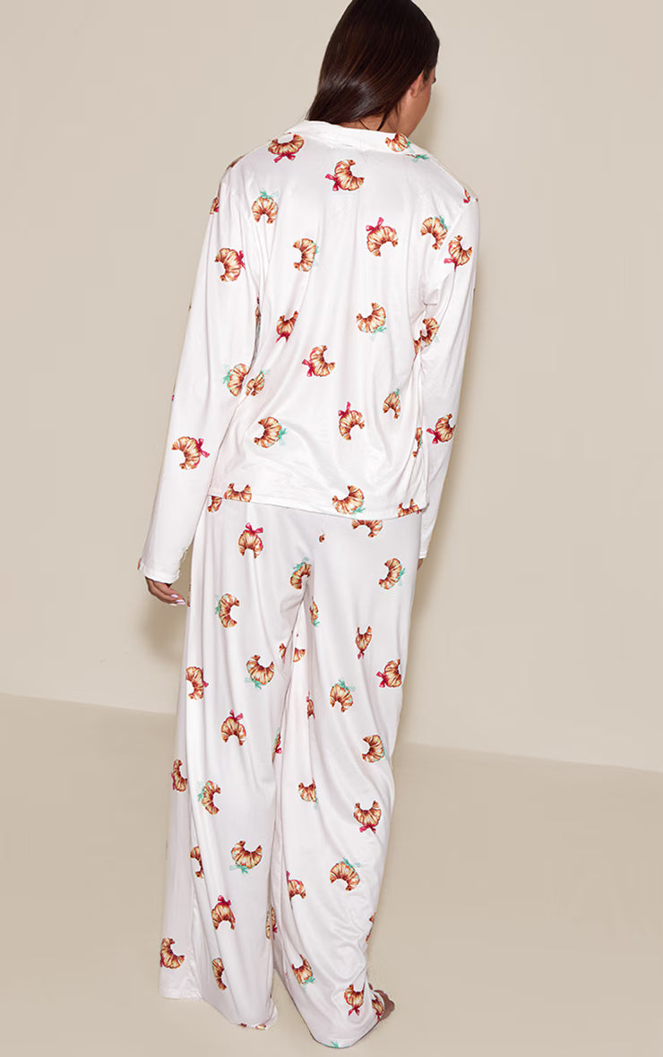 Add sweetness to your sleepwear with the cream bow croissant long sleeve button through pj set. Made in soft fabric with playful bow prints, it’s both cosy and chic. Pair with fluffy slippers for lounging or wear the shirt tucked into jeans for a playful daytime look.
