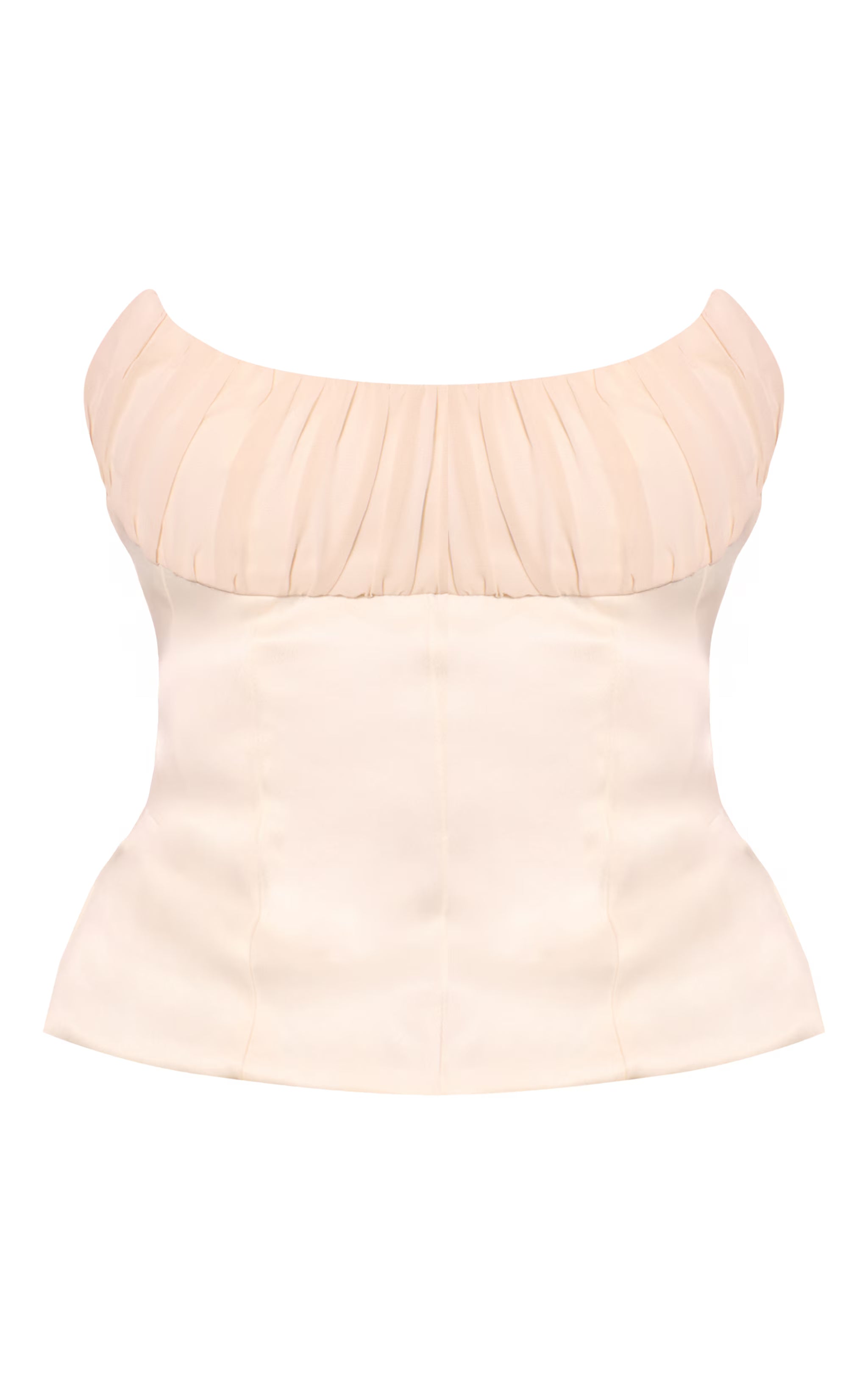 Curate a look that speaks volumes after dark. The cream chiffon bust bandeau corset delivers a refined statement with its elegant cream hue and artfully ruched chiffon bust, contrasting with a structured bandeau body that shapes and defines. Its clean lines and confident cut make it the ultimate choice for evening dressing. Pair yours with sleek black pants and towering platform heels for a truly elevated ensemble, finishing the look with delicate gold stud earrings to complete a sophisticated vibe.