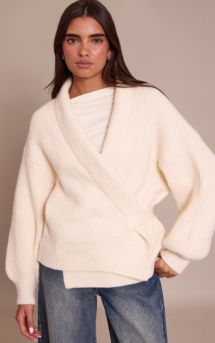 Make effortlessly chic a daily habit with the cream chunky knit rib wrap cardigan. Its relaxed silhouette and generous rib knit offer a comfortable yet refined shape, while the flattering wrap design creates a natural V-neckline, secured by an integrated tie for versatile styling. Puffed sleeves add a subtle volume, softening the profile for an artful touch. Layer this versatile piece over a basic tee and wide-leg pants for an understated daytime aesthetic, finishing the look with a pair of chunky boots to ground the silhouette with a modern edge and a subtle gold ring for knowing polish.