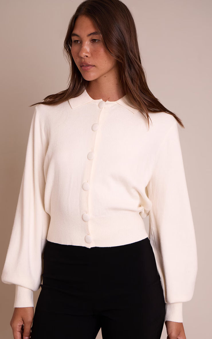 The cream compact knit fabric covered button cardigan is a refined layering piece for any wardrobe. Its soft compact knit construction and fabric-covered buttons add an elevated touch to a classic silhouette. Wear it over dresses, tucked into tailored pants, or with denim for a chic, versatile look.