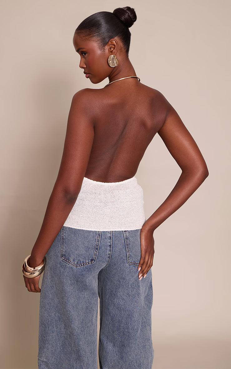 For a look that truly sets the tone, consider this artful evening piece. The cream gold cuff detail knitted top commands attention with its dramatic halter neckline and a confident cowl plunge, elegantly framed by an integrated gold-tone cuff embellishment that ensures an undeniable focal point. Its sleek, knitted silhouette follows your form with effortless poise, making it a natural choice for after-dark allure. Team this standout top with sharp, high-waisted tailored pants to complete a streamlined profile. Finish your ensemble with striking black platform heels and a delicate gold ring to elevate your presence and own the moment.