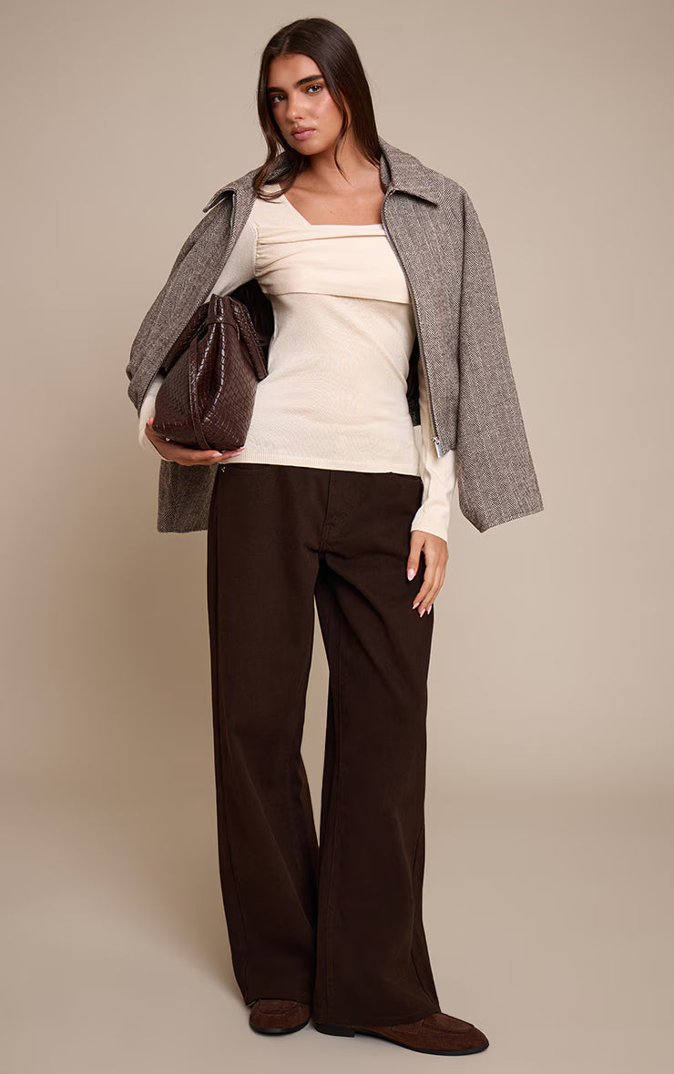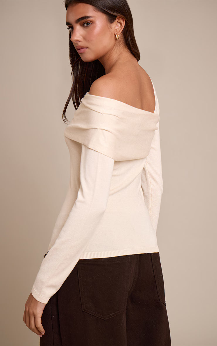 Own the art of modern evening wear with a piece that masters subtle asymmetry. The cream long sleeve asymmetric shoulder knitted top is a masterclass in refined design, presenting a knowing asymmetric neckline that drapes elegantly across one shoulder, offset by a sharp, structured square neckline on the other. Its long sleeves complete the sleek silhouette, cementing its status as a true focal point for any discerning event. Pair this distinctive knitwear with tailored wide-leg pants and sleek clear heels for an effortlessly polished ensemble, finishing the look with bold statement earrings to make an artful impression.