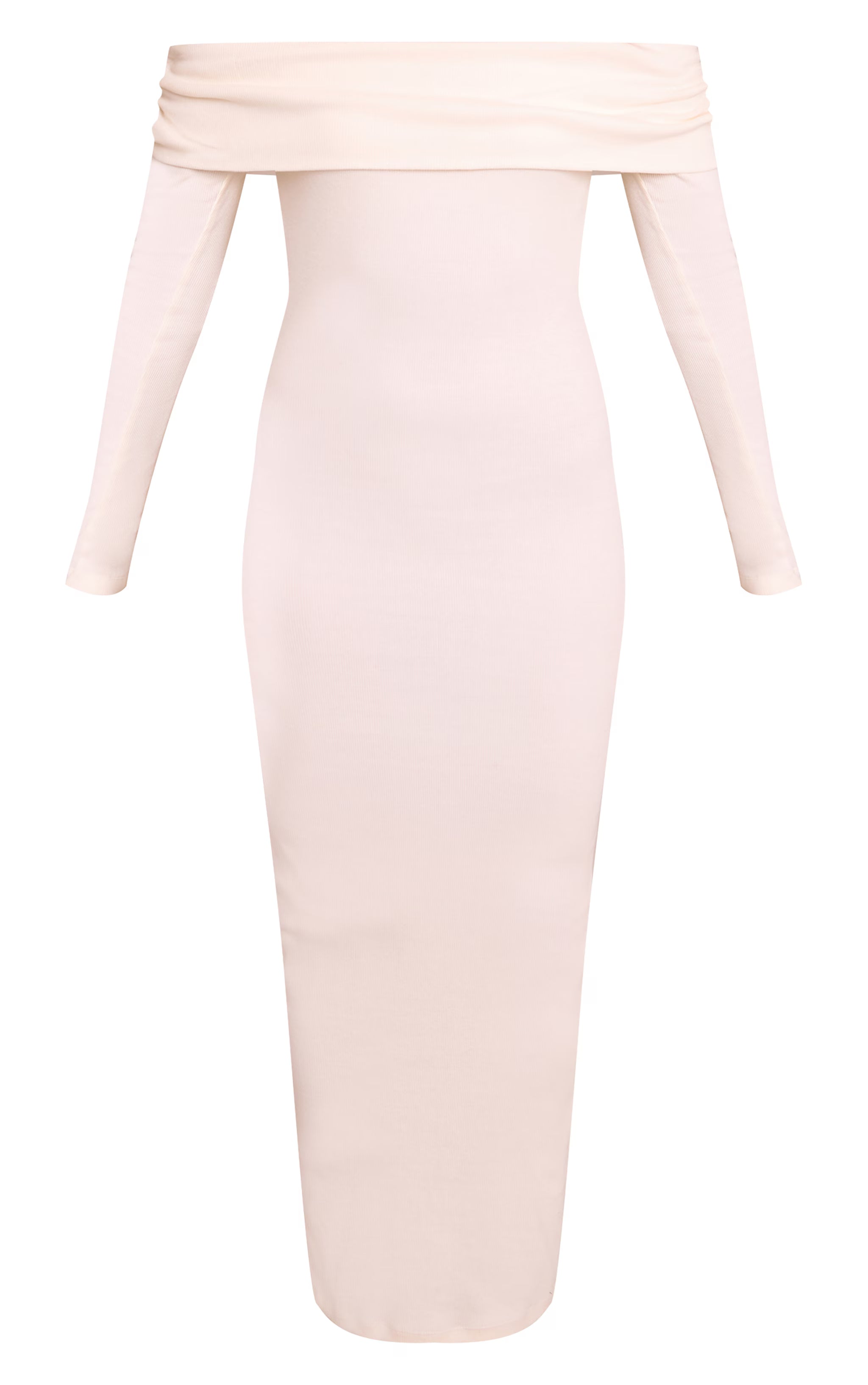 The cream ribbed fold over bardot long sleeve maxi dress is effortlessly elegant with a soft ribbed texture and fold-over bardot neckline. Its maxi length creates a flowing silhouette that skims the body. Style with strappy heels for evening sophistication or layer with a cropped jacket and flats for casual chic.
