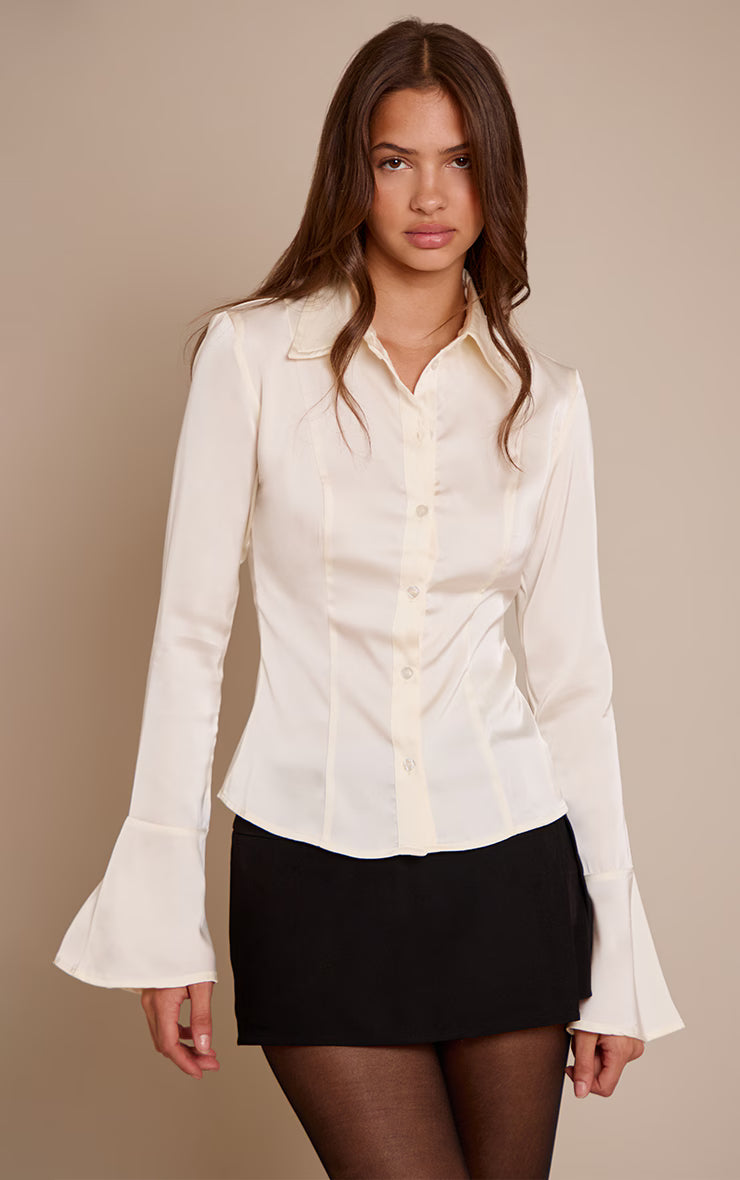 Stay polished in the cream satin flared sleeve fitted shirt. Made from a cream satin material, it features flared sleeves, a fitted silhouette, and button fastening. Style with slip on mule heels and a clutch bag for an effortlessly chic touch.