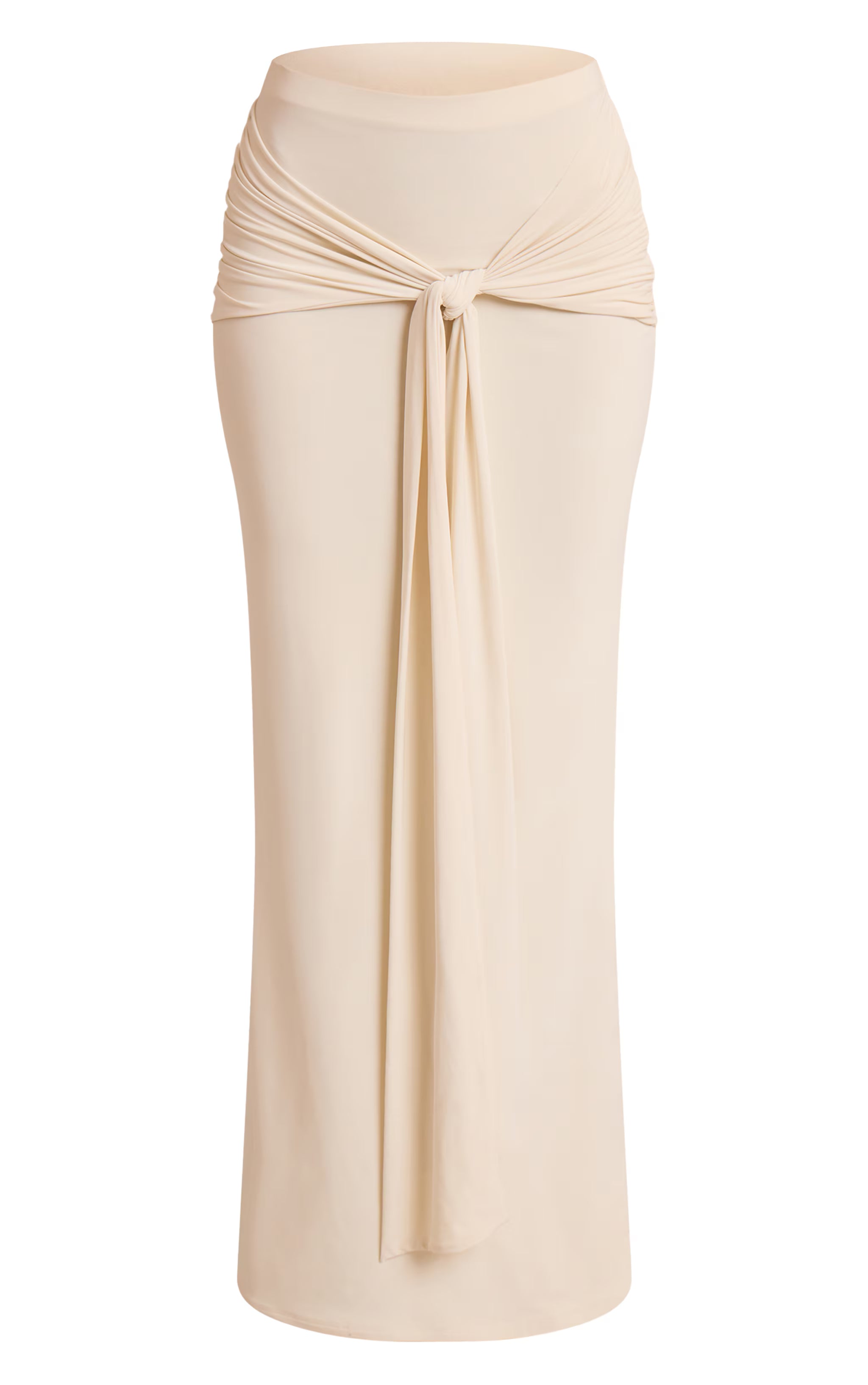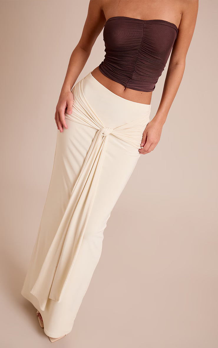 Redefine evening elegance with a silhouette designed to turn heads. The cream slinky knot detail maxi skirt boasts a directional knot detail at the waist that drapes into a sweeping maxi length, its cream hue offering a sophisticated base for any ensemble. Pair this statement bottom with a sleek bandeau or a sophisticated corset top, then elevate the look further with a pair of heeled boots, adding an unexpected edge to the refined aesthetic. Finish the moment with subtle gold earrings, drawing attention to a clean neckline, for an evening that demands effortless style.