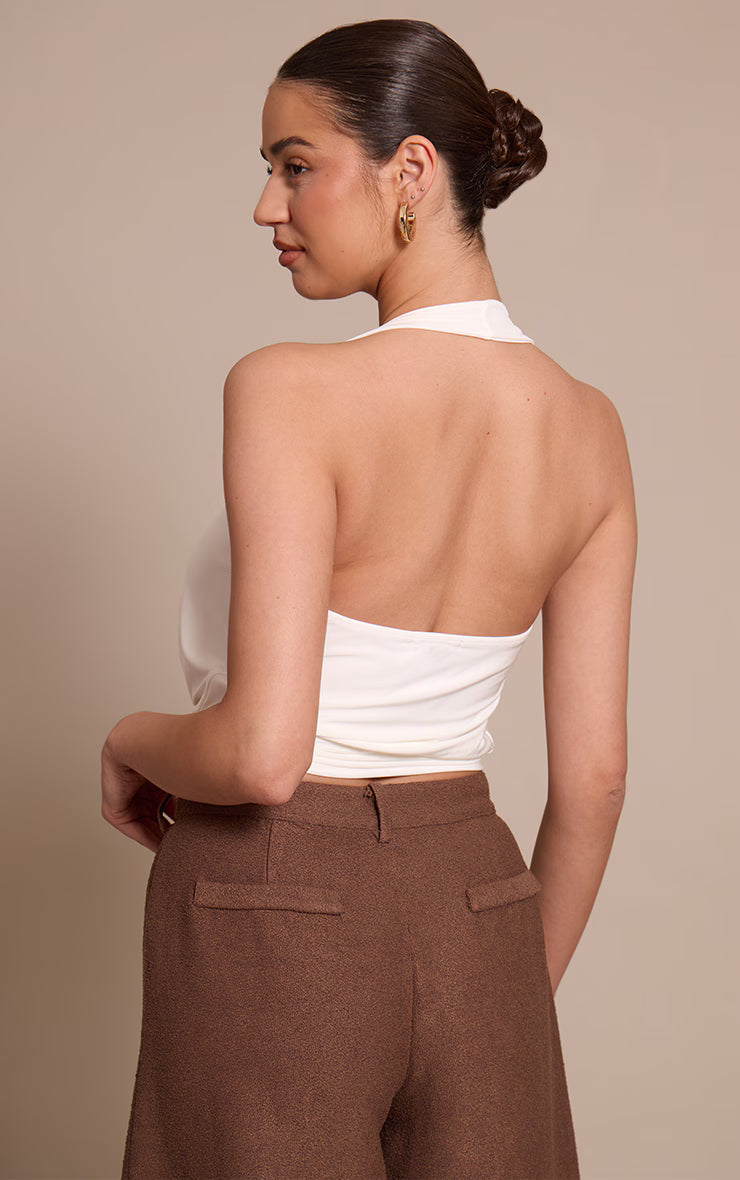 For those nights that demand confident style, the cream slinky plunge halterneck top delivers a refined evening aesthetic. This essential piece features a dramatic plunge halterneck neckline, balanced by an artful wrap-around waist detail that cinches the silhouette. Its pristine cream hue offers a sophisticated base, perfect for pairing with tailored wide-leg pants and sharp white heels for a cohesive, powerful ensemble. Complete your look with stacked gold cuff bracelets for an undeniable, knowing finish that commands the room.