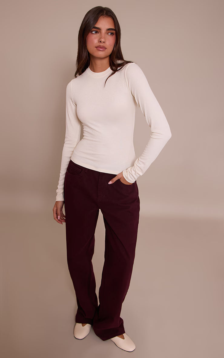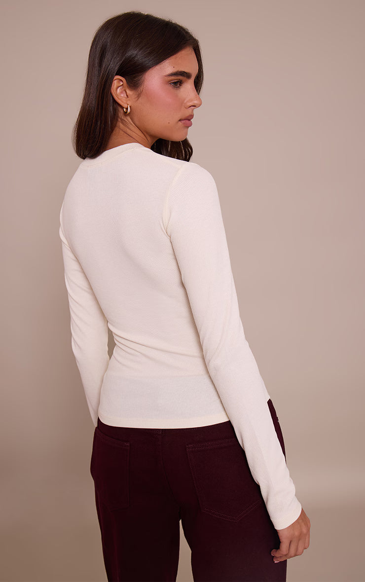 The cream soft rib crew neck long sleeve top is a minimalist staple you’ll reach for all season. Its soft ribbed texture and neutral tone make it ideal for layering or wearing solo. Style with tonal pants and gold accessories for a chic, understated finish.