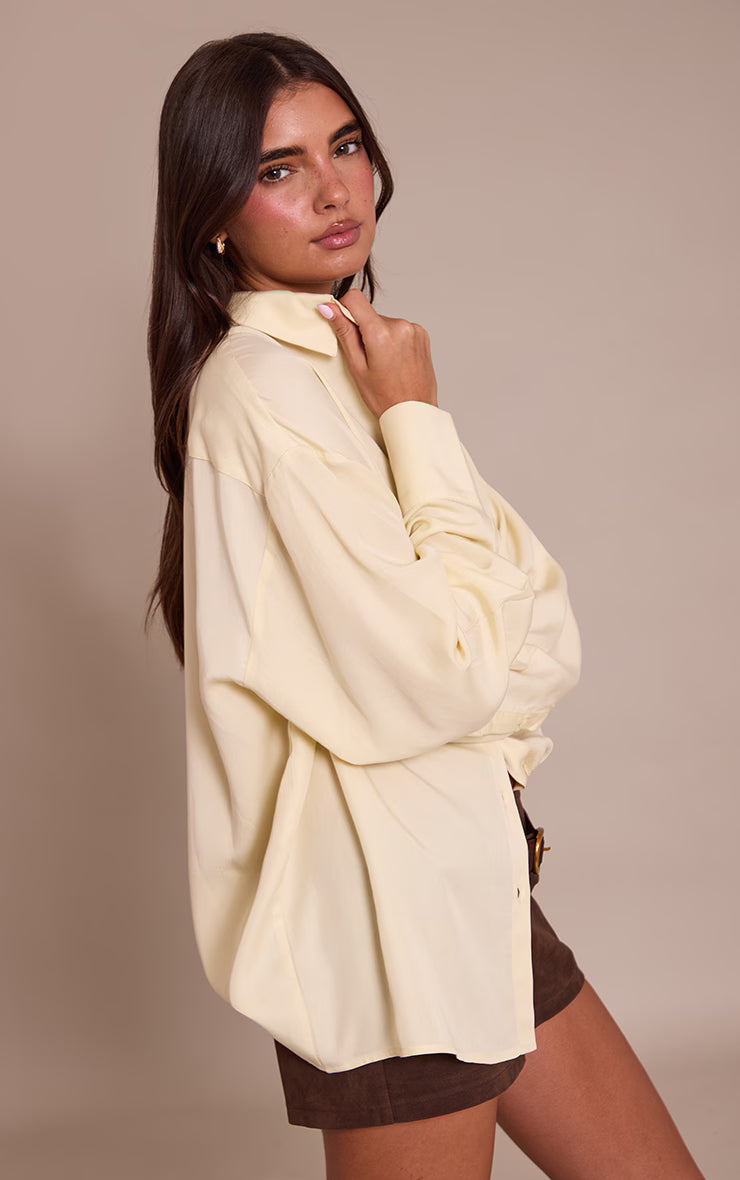 Bring ease to your wardrobe with the cream tencel oversized shirt. Designed in fluid tencel fabric, it features a classic collar, button front and oversized fit for relaxed styling. Team with wide leg pants and a clutch bag for casual chic.