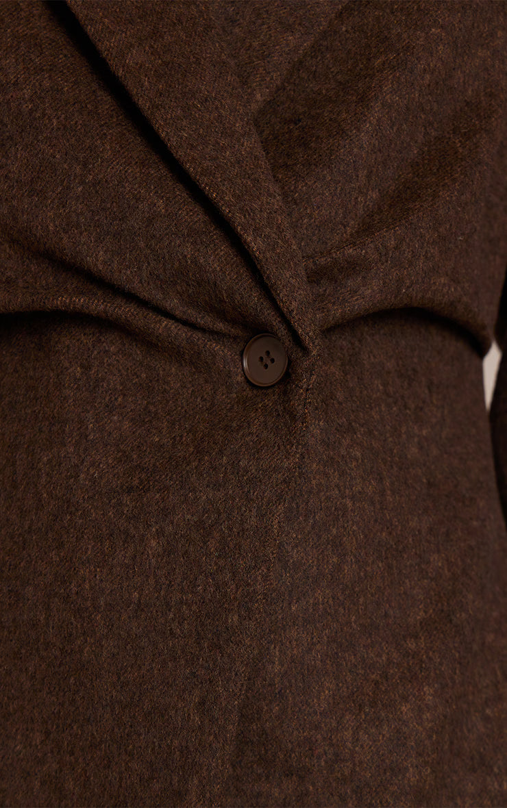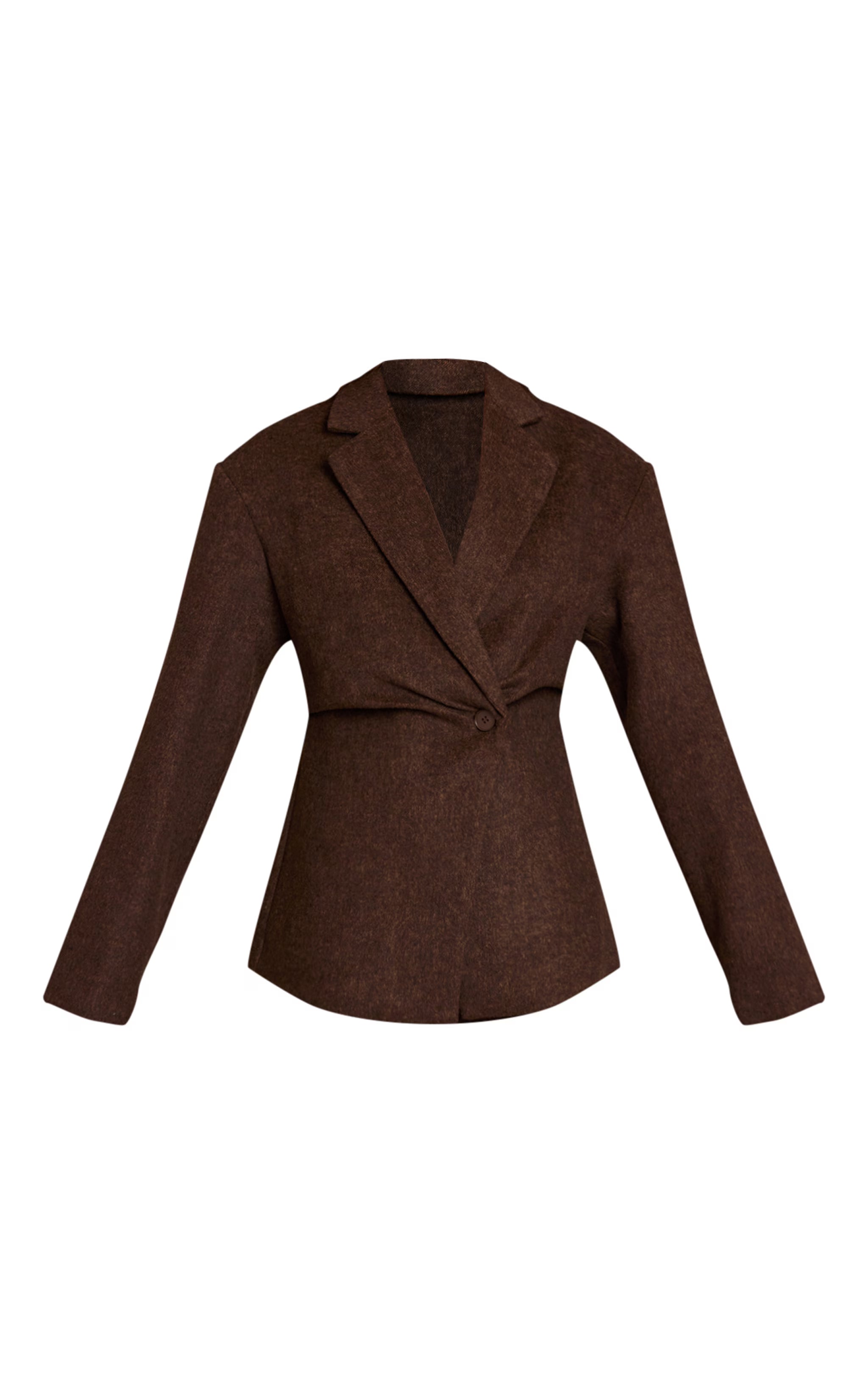 Power dressing gets a modern update with the dark brown brushed pinstripe cinched waist blazer. This artfully designed piece reworks classic tailoring with a distinctive v-neckline and a single-button fastening that sculpts the waist, creating a defined and powerful silhouette. Its notched lapels and structured shoulders maintain an air of sharp sophistication. Wear yours with coordinating wide-leg pants for a cohesive power suit look, complete the ensemble with sleek black heels, and add a pop of lustre with gold earrings to truly own the room. This blazer is your sartorial statement for impactful day wear.