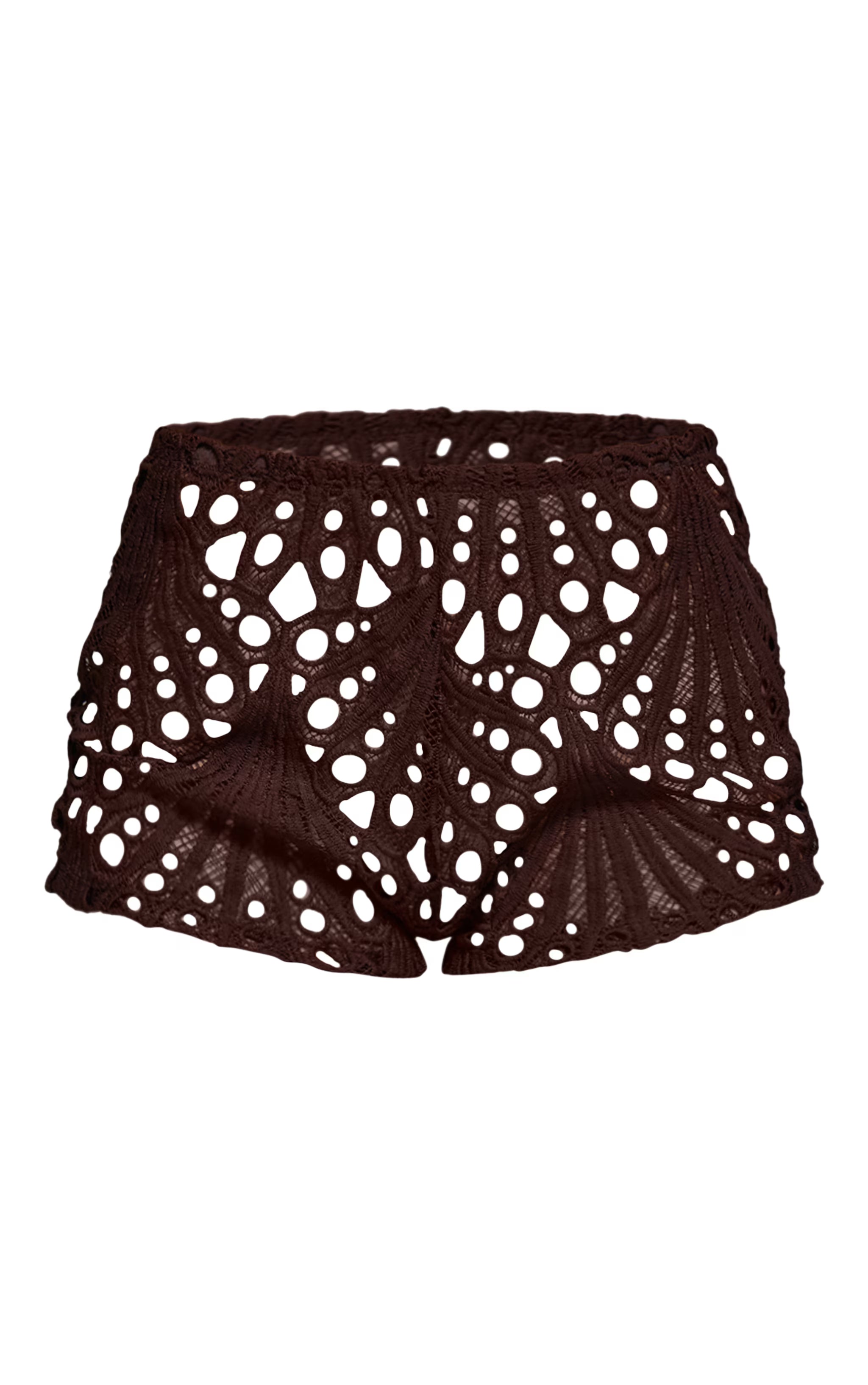 Discover the power of intricate design for your next evening affair with this compelling dark brown two piece set. The high mock neckline of the top, coupled with its elegant long bell sleeves, creates a sophisticated silhouette, while the all-over floral lace overlay introduces an artful, sheer finish. Completing the look, the matching dark brown floral lace hot Pant features a flattering high-waisted cut and delicate ruffled hem. Elevate this confident ensemble with sleek ankle boots for a contemporary edge and carry a minimalist black bag to perfect your after-dark aesthetic.