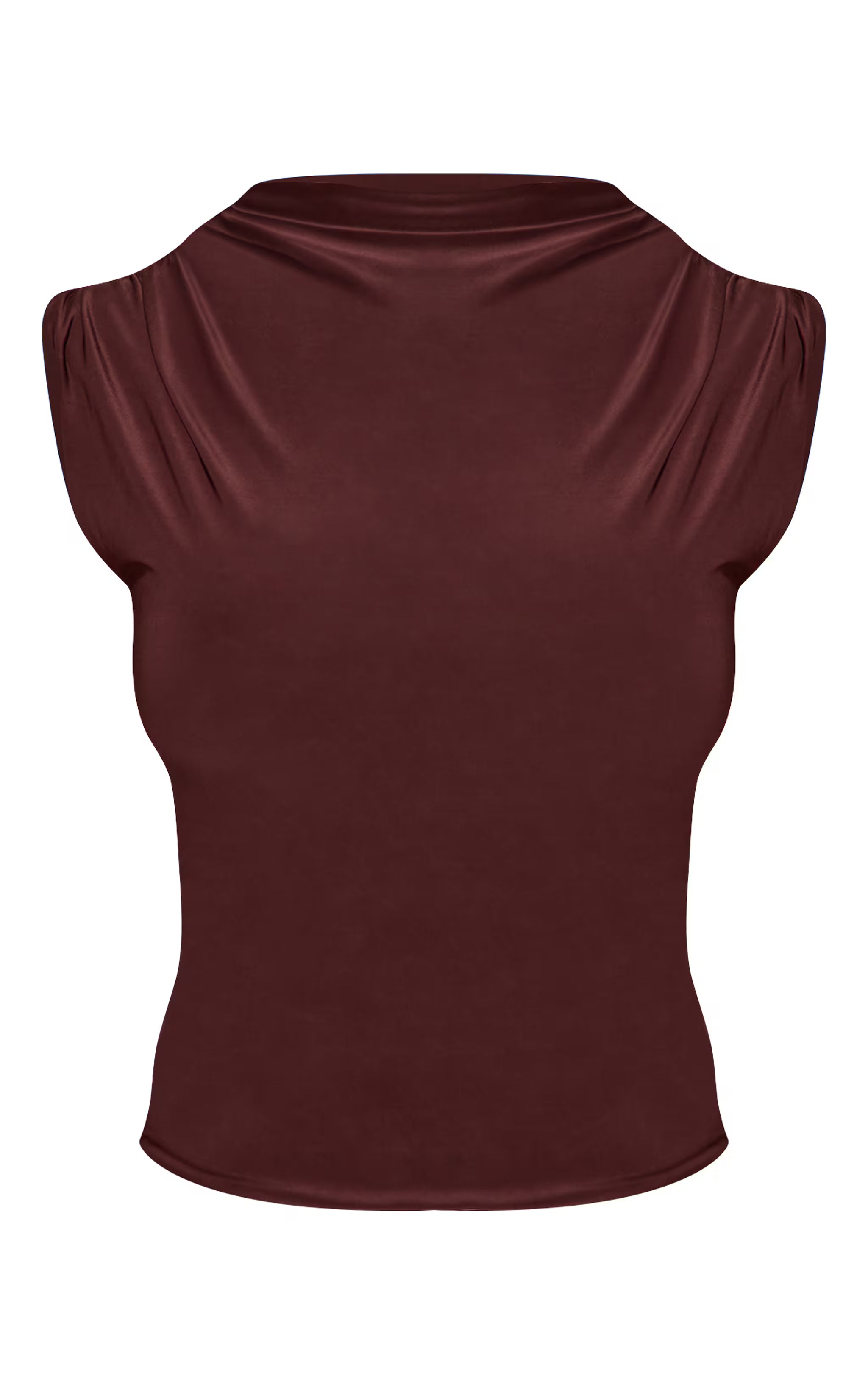 Introduce effortless glamour with the dark chocolate double layer slinky drape detail long top. Cut from dark chocolate double-layer slinky fabric, the gently draped front and close fit contour your shape with ease. Team with tailored pants or a midi skirt and kitten heels and a shoulder bag for sleek polish.