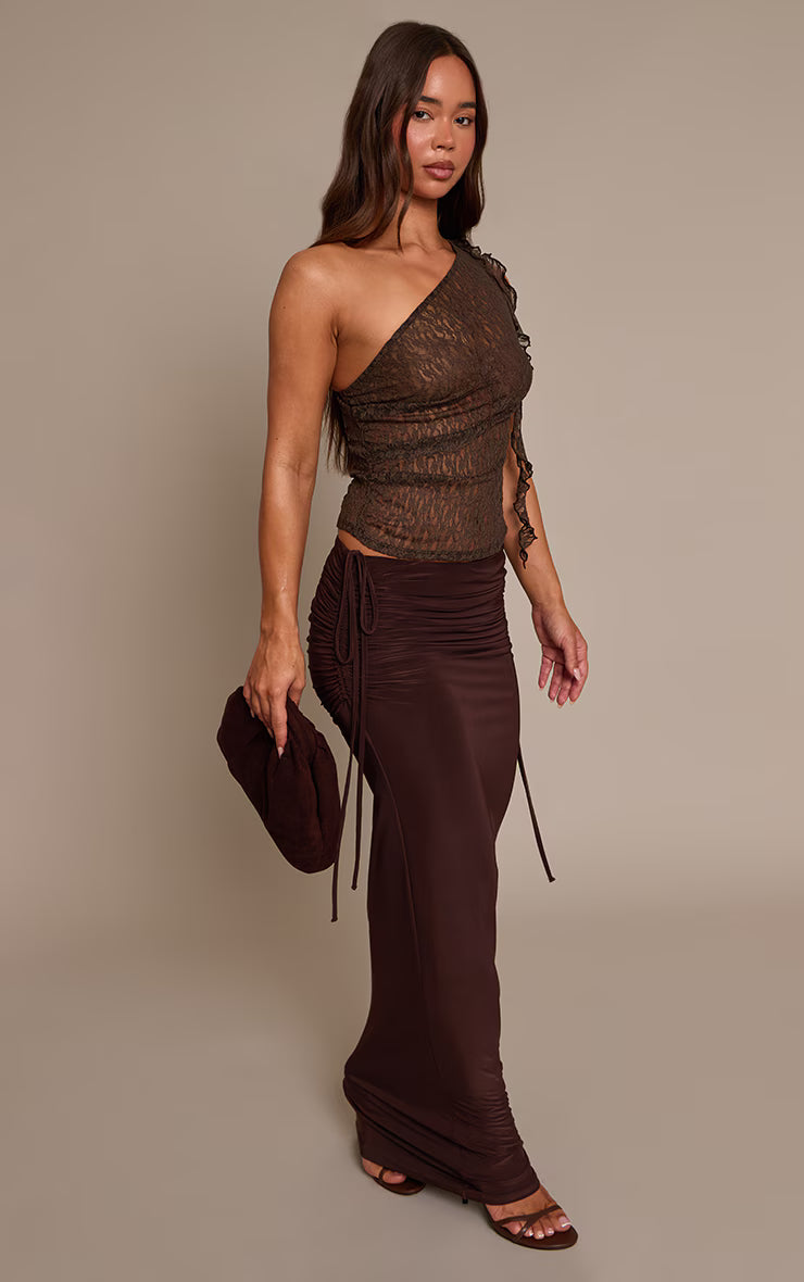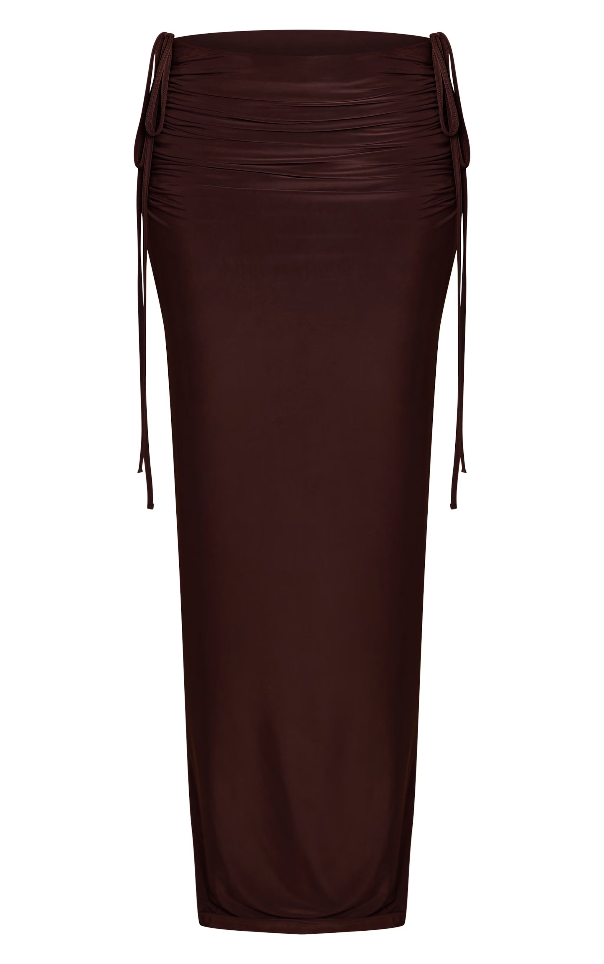 Command attention with a knowing edge in this dark chocolate double layer slinky ruched side maxi skirt. This piece redefines evening wear with its artfully sculpted maxi silhouette, enhanced by clever ruching detail on each side that allows for a customisable fit and dynamic drape. The deep dark chocolate hue ensures a sophisticated appeal, while the double-layer design offers a confident, sleek finish. Pair this distinctive skirt with a contrasting sheer top or a structured corset, completing your elevated aesthetic with sleek knee-high boots and a minimalist black shoulder bag. It's the ultimate foundation for an unforgettable night out.
