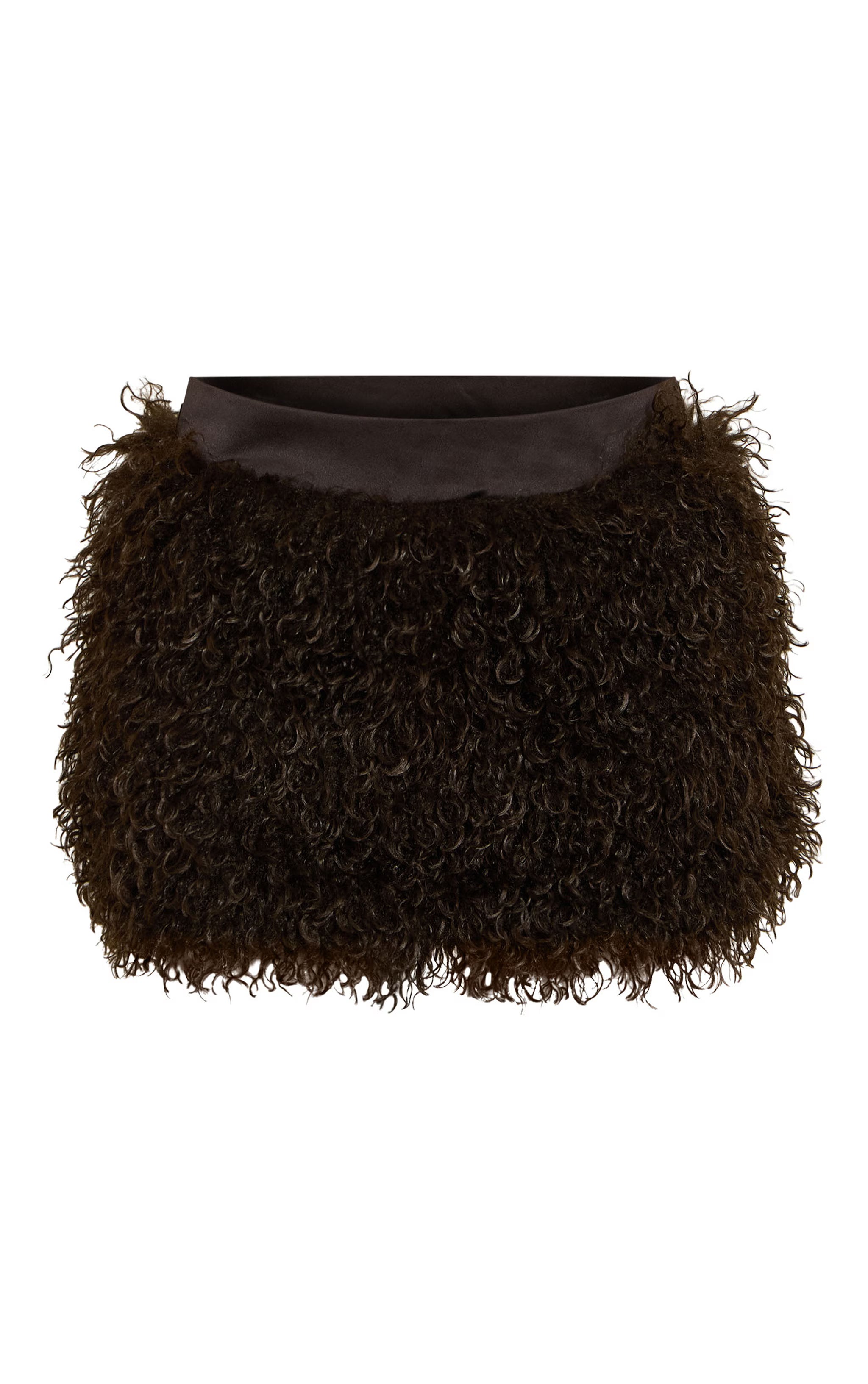 Add a touch of luxe to your outfit with the dark chocolate mongolian fur mini skirt. Crafted from soft deep brown faux fur, this skirt has a stretch waist and a mini length fit. Wear with a fitted bodysuit and strappy heels for a night-out look, or layer with an oversized knit for playful contrast.