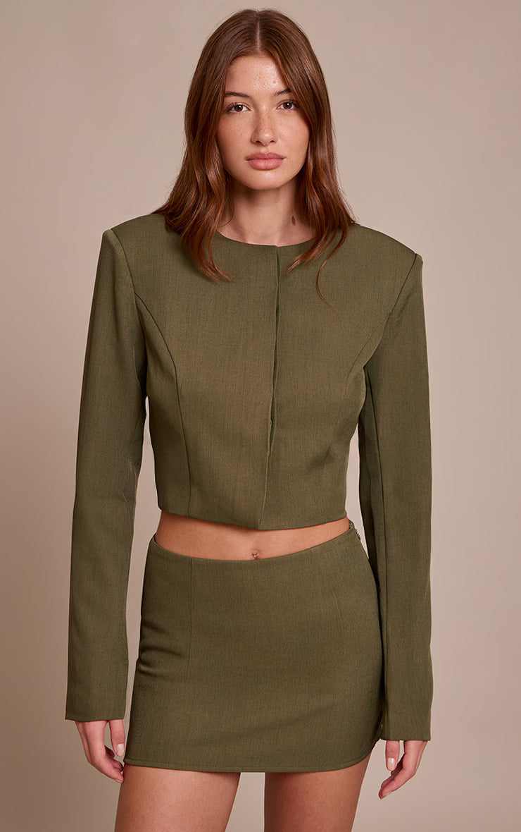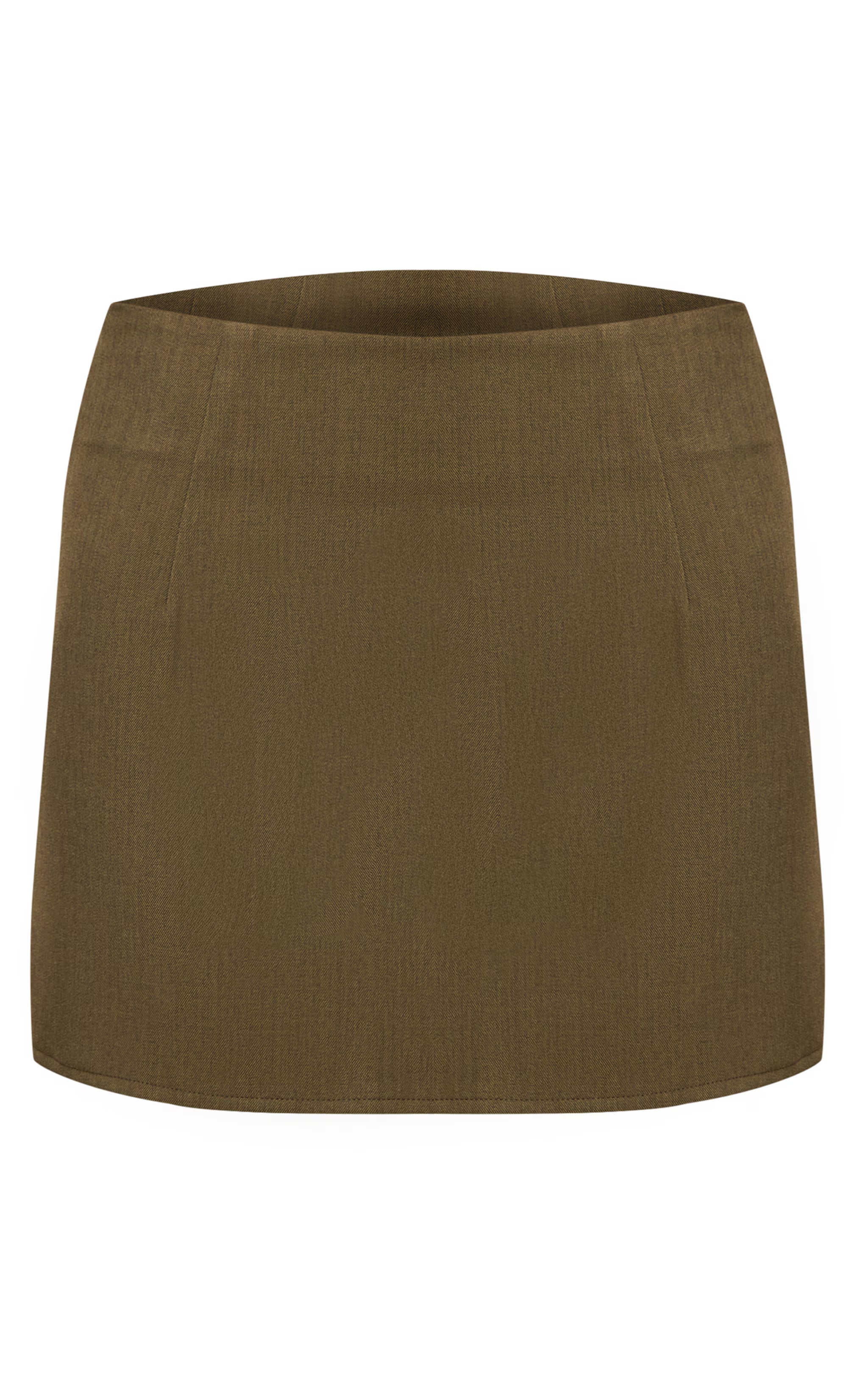 Here’s the definitive piece for your elevated evening edits. The dark khaki tailored woven mini skirt brings an astute precision to your look, cut with a clean, short silhouette that speaks to confident styling. Its minimalist design means it acts as the perfect anchor; team it with a sharp collared blouse for a directional contrast or the coordinating cropped blazer for an impactful two piece set. Finish your presence with sleek ankle boots and a sophisticated clutch bag, making every move an effortless statement.