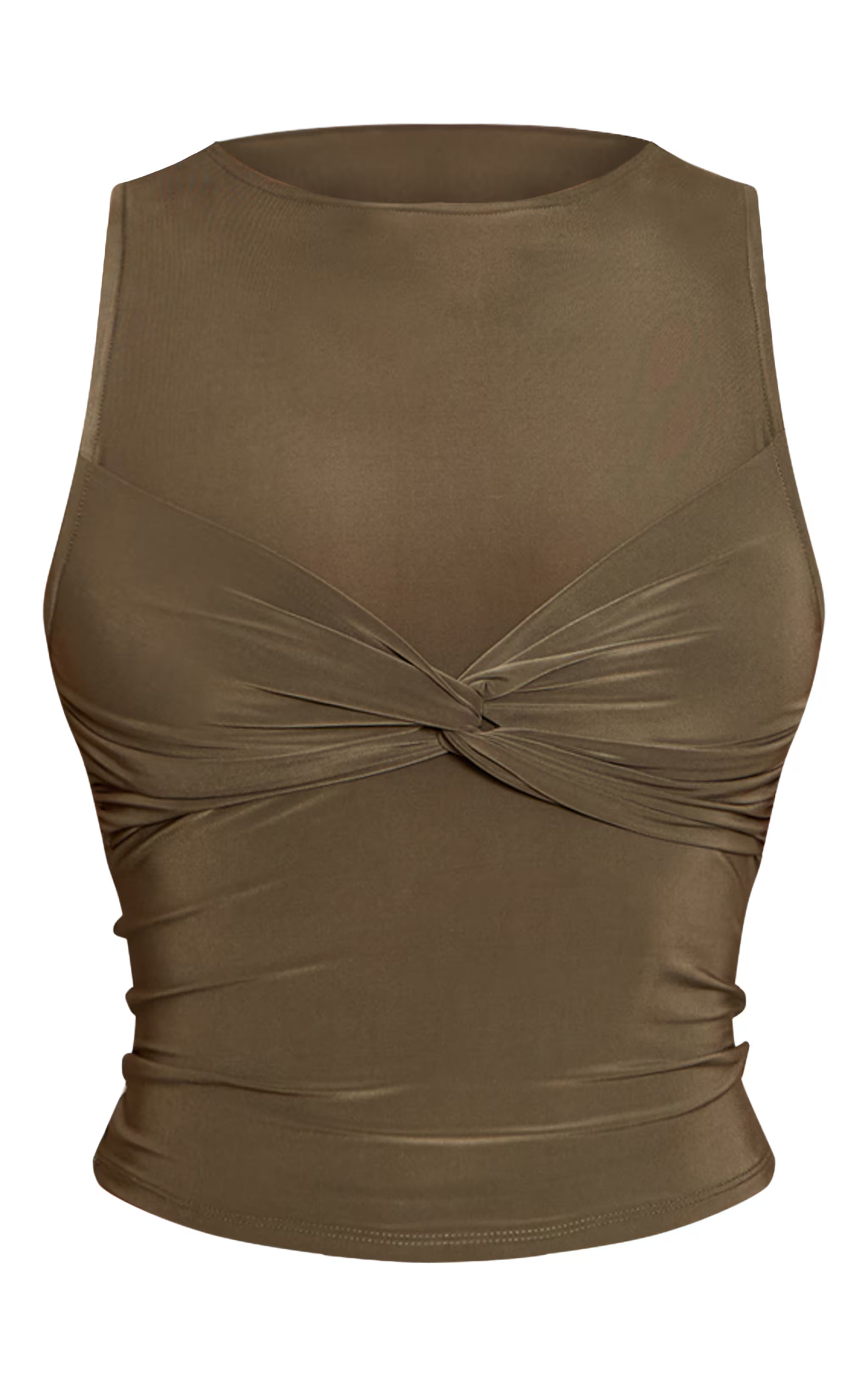 A knowing addition to your eveningwear, the dark olive slinky twist bust detail top asserts a confident presence with its distinctive design. This effortlessly chic cami showcases a streamlined high neckline and an artful twist detail at the bust, creating a striking focal point. Its sleeveless cut and subtly cropped finish pair perfectly with high-waisted tailored pants, creating an elongated line. Ground your look with sleek heeled boots and complete the edit with a flash of gold through statement hoops, ensuring your style is unmistakably sharp and utterly your own.