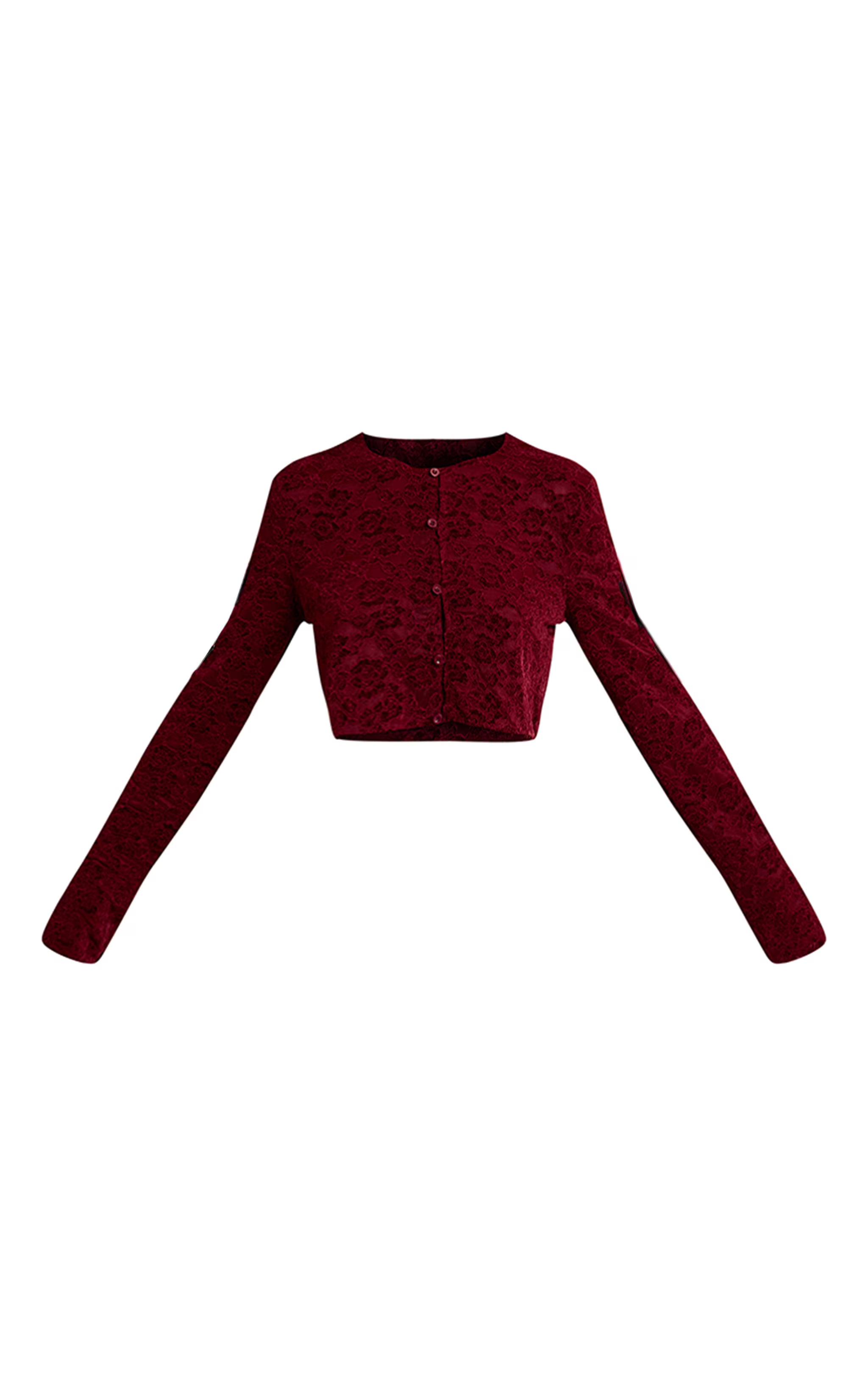 Bring sophistication to your evening separates with the dark wine lace button up long sleeve crop top. Made from delicate floral lace in a deep wine shade, this cropped top features button detailing and a fitted silhouette. Pair with the matching lace mini skirt and heels for a coordinated, romantic ensemble.