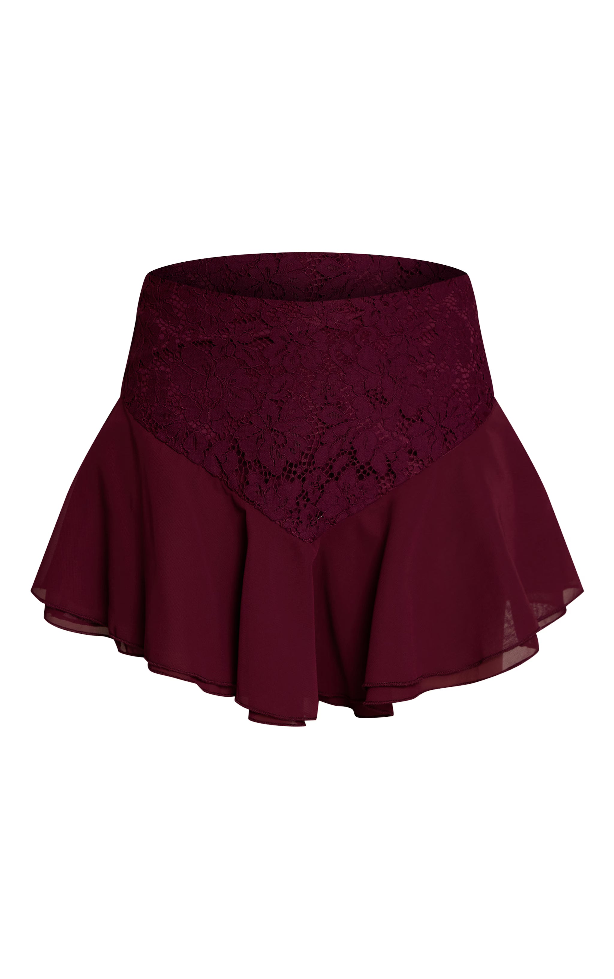Infuse your eveningwear edit with undeniable allure; the dark wine lace frill mini skirt is set to redefine your after-dark look. This striking mini silhouette features intricate lace detailing across its upper panel, descending into a playful, sheer frill hem that creates dynamic movement with every step. Its rich dark wine hue offers a sophisticated yet bold aesthetic, perfect for making a confident statement. Pair this piece with a sleek, minimalist top or a complementary lace camisole to balance the look, anchoring the ensemble with sophisticated stiletto heels and a compact black clutch bag for a cohesive, powerful finish.