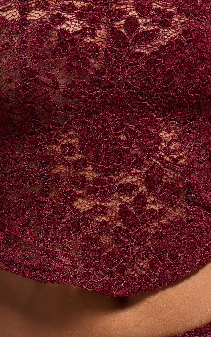 A rich red hue meets intricate lace in the dark wine lace square neck long top, designed for a confident evening statement. This top features a flattering square neckline and a unique sheer lace fabrication that creates an artful, layered effect. Pair it with matching pants for a coordinated look, or elevate it with tailored pieces and step out in chic ankle boots, adding delicate gold stud earrings to complete your polished ensemble.