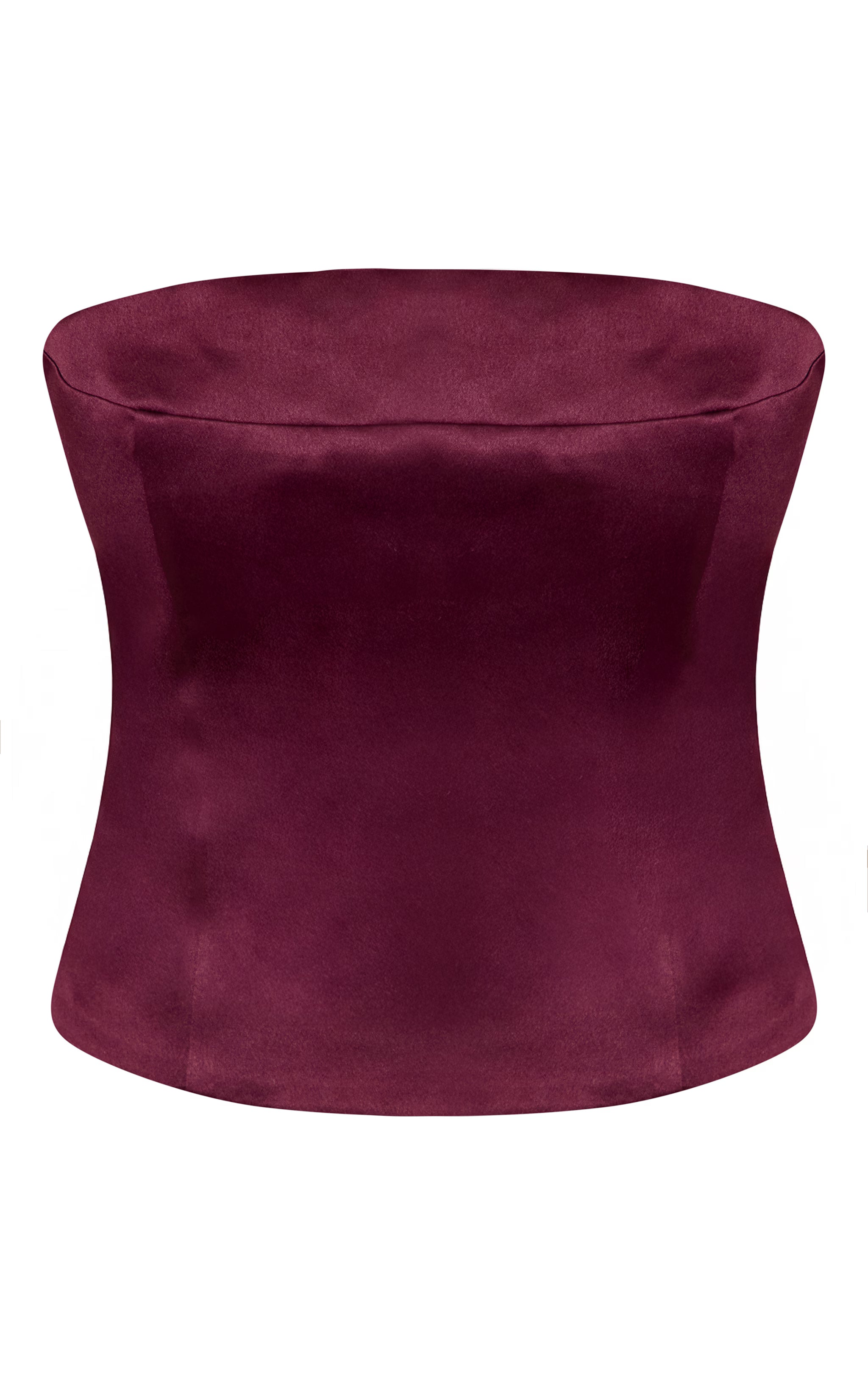 Set the tone in the dark wine satin bandeau top. The fluid satin body and structured internal grip create a secure, sculpted fit that flatters the neckline. Wear with the coordinating pants and a clutch bag for seamless occasion styling.