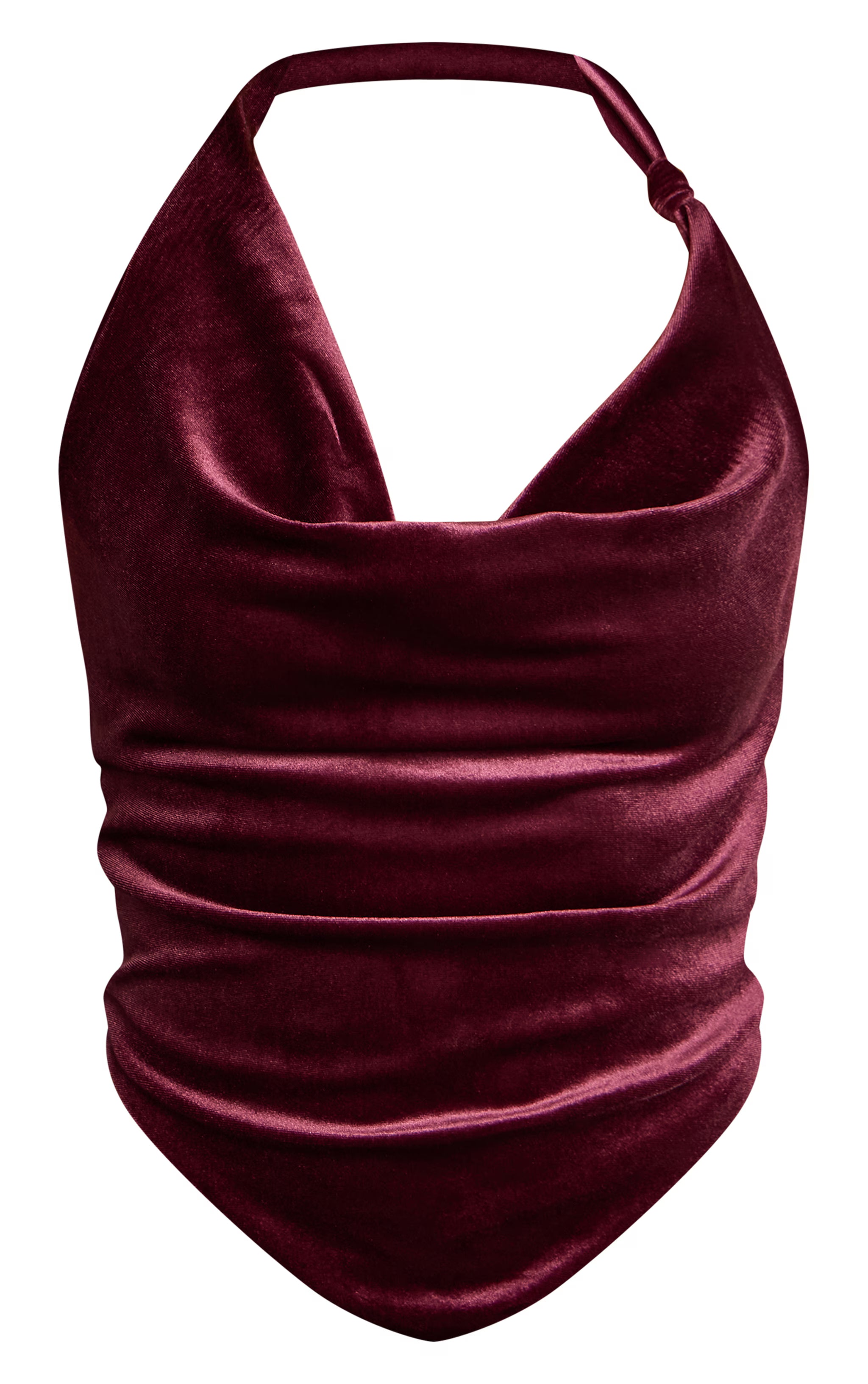 Make your presence felt. The dark wine velvet cowl neck knot long top drapes with intention, forming a soft cowl neckline that flows to an asymmetric hem, carefully shaped by a side knot and a slender halter-neck design. Partner this memorable piece with its matching skirt and gold heels, bringing the full look together with a black shoulder bag, sealing your signature style.