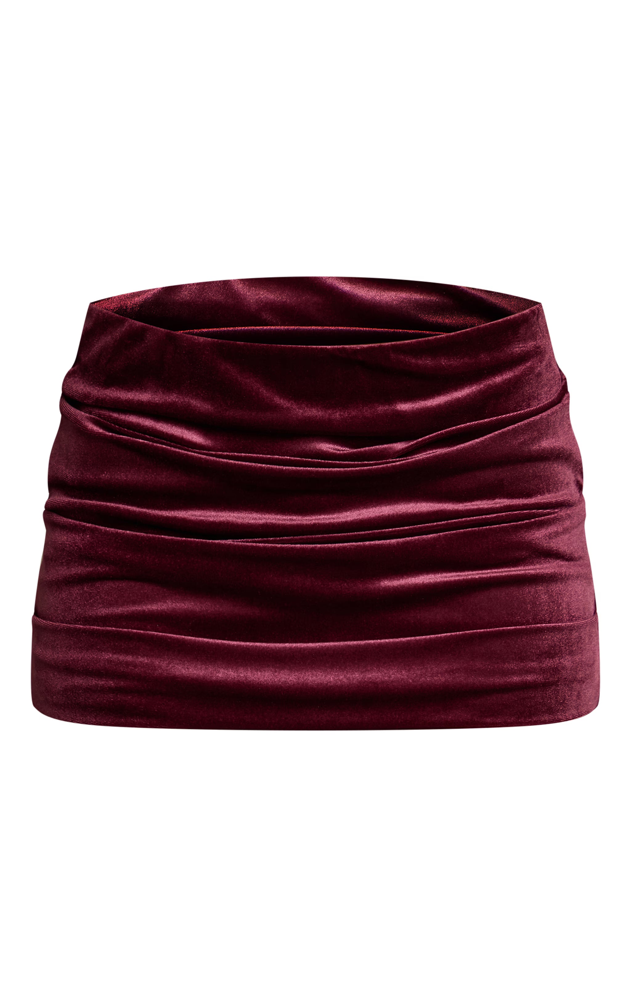 For moments that demand impact, this skirt delivers. The dark wine velvet ruched mini skirt is expertly ruched throughout to define its confident mini cut, ensuring you make a distinct statement. Style yours with a pared-back cami and commanding knee high boots, finishing with a sleek clutch bag for a sophisticated after-dark ensemble that’s undeniably PrettyLittleThing.