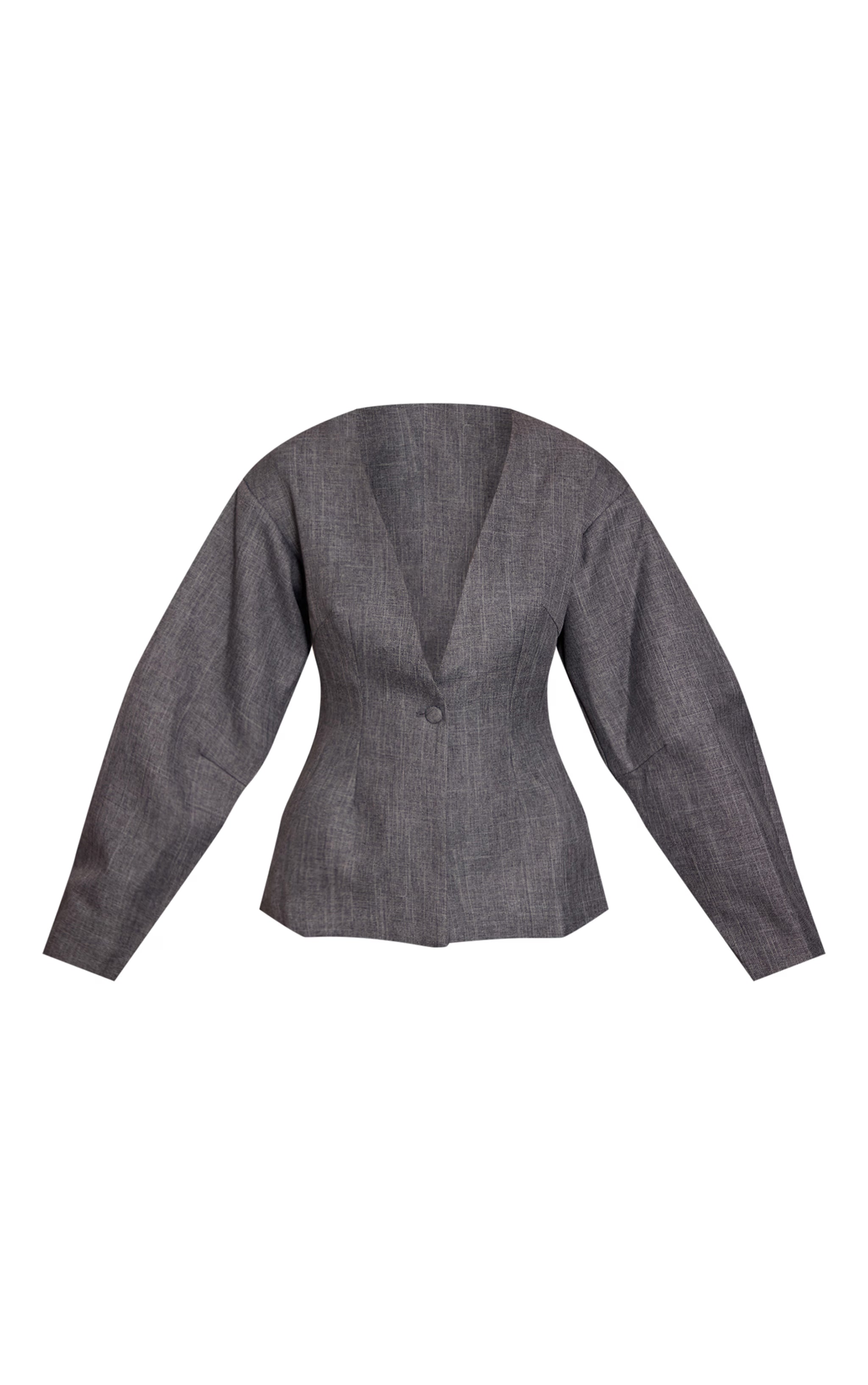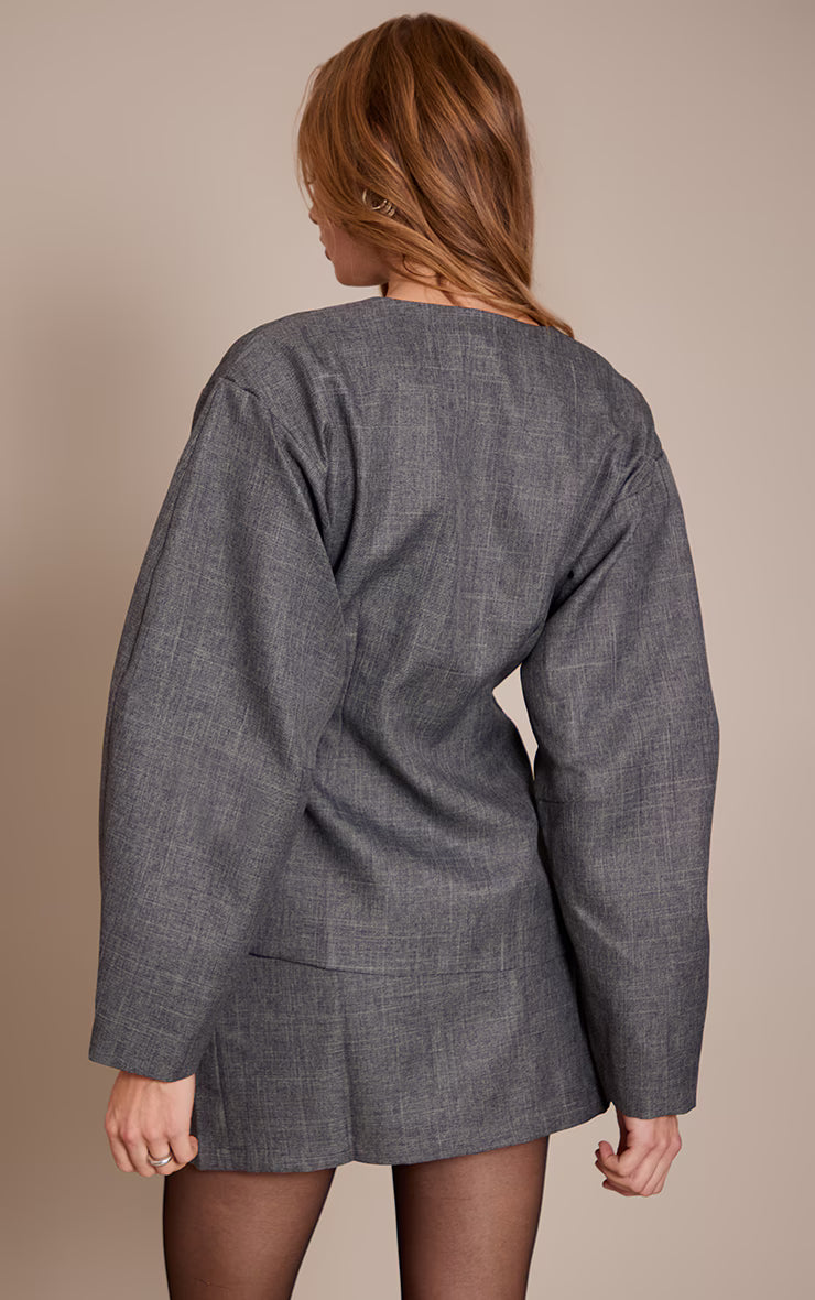 Redefine power dressing with modern precision. The grey cinched waist cocoon sleeve blazer delivers an artful silhouette, featuring a deep V-neckline that plunges to a single button fastening, creating an effortlessly sculpted mid-section. Its exaggerated cocoon sleeves add a confident, contemporary volume that tapers elegantly at the wrist. Style this statement piece with its matching tailored mini skirt for a cohesive day look, complete with sleek white kitten heels and a subtle flash of gold earrings to command attention with ease.
