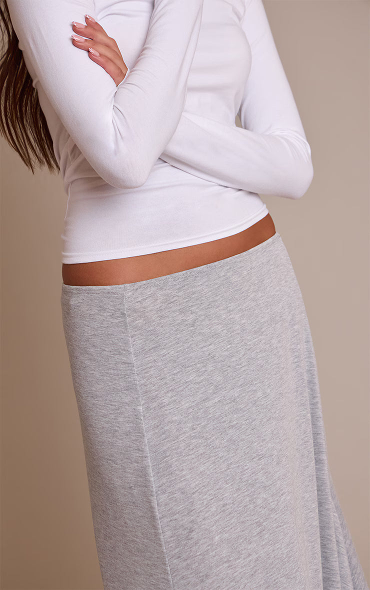 Own the flow of your day in a piece designed for effortless movement. The grey marl jersey hanky hem midi skirt delivers a modern silhouette with its dynamic, asymmetrical hemline, creating an artful drape. Its midi length offers a sophisticated profile, while the relaxed cut ensures versatile wear from morning to evening. Pair this contemporary bottom with a fitted long-sleeve top to highlight its unique shape, completing your look with minimalist flats for an understated polish. Add refined gold earrings and a structured mini bag to elevate the ensemble, ensuring a knowing aesthetic that effortlessly transitions through your daily agenda.