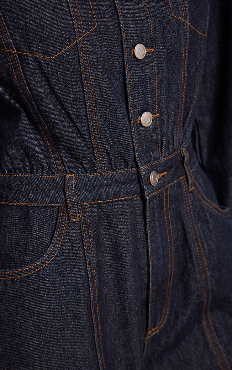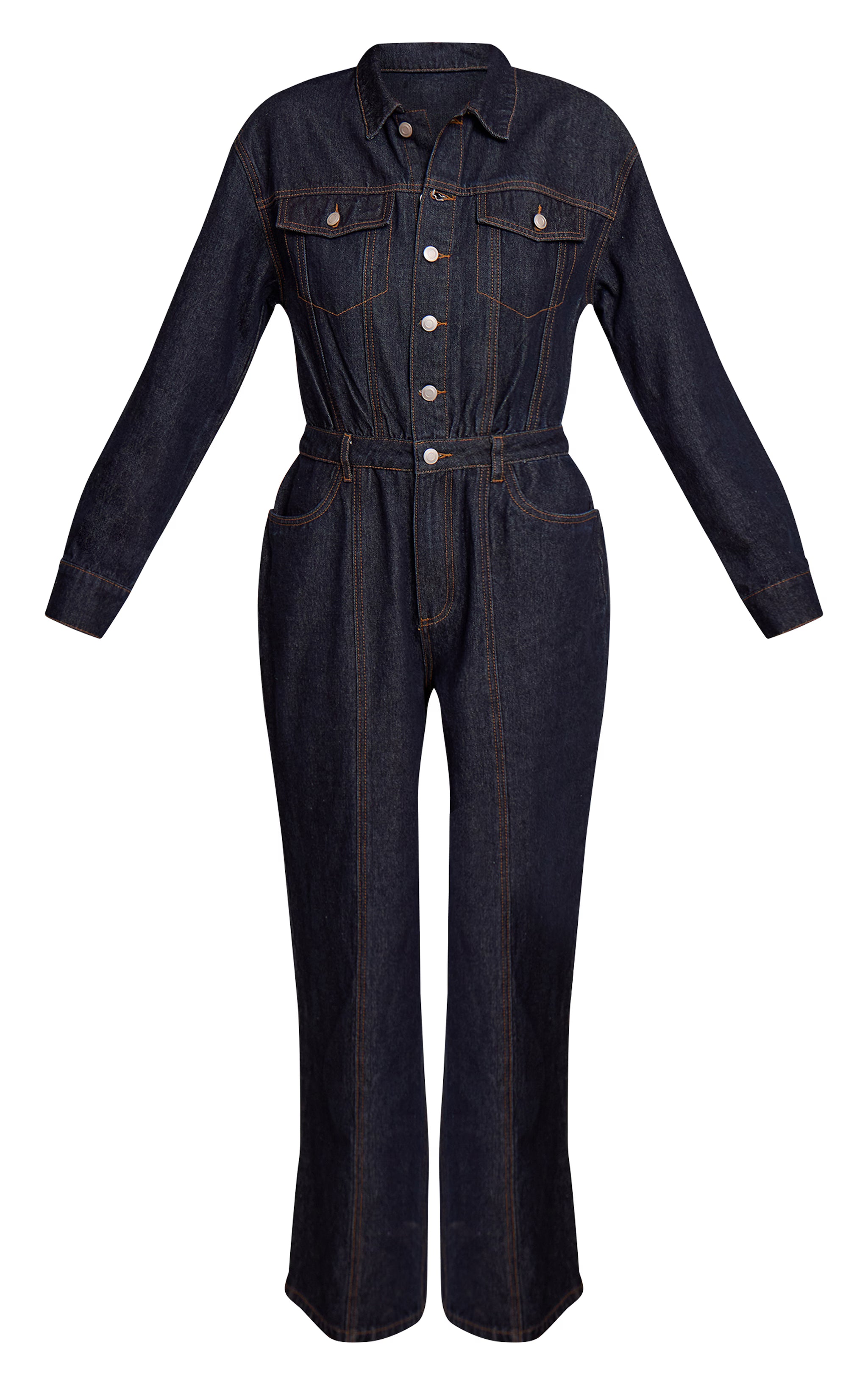 Master effortless cool. The indigo contrast stitch long sleeve denim jumpsuit redefines daywear with its structured yet relaxed silhouette. Crafted from deep indigo denim, it features a smart collared neckline and a full button-through front, accented by striking contrast stitching and practical chest and side pockets. A defined waist gives way to a contemporary wide-leg cut, making it the ultimate foundation for your off-duty wardrobe. Team this versatile piece with chunky boots and an oversized tote bag for a commanding day look that doesn’t compromise on style.