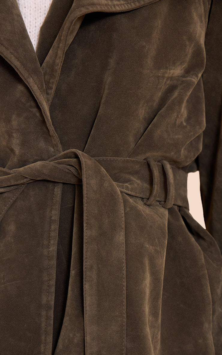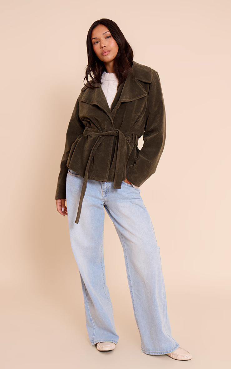 Anchor your look with an undeniable edge. The khaki faux suede belted jacket redefines effortless chic with its relaxed, yet structured silhouette. Its wide, draped lapels frame a confident profile, while the adjustable self-tie belt cinches the waist to create a flattering, versatile shape, perfect for confidently navigating your day. Layer this essential piece over a crisp white shirt and tailored wide-leg pants, finishing the ensemble with sleek ankle boots and a subtle gold ring for a composed and polished aesthetic that speaks volumes.