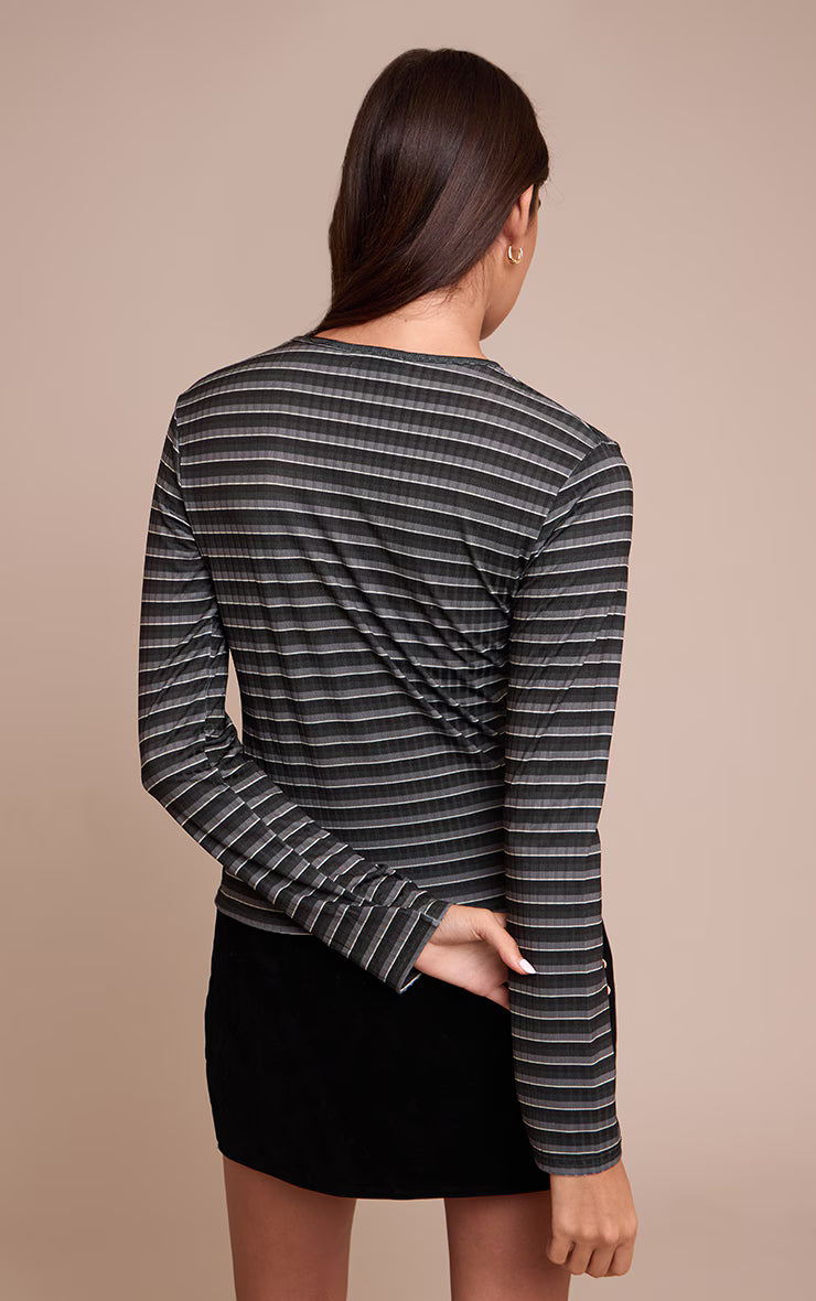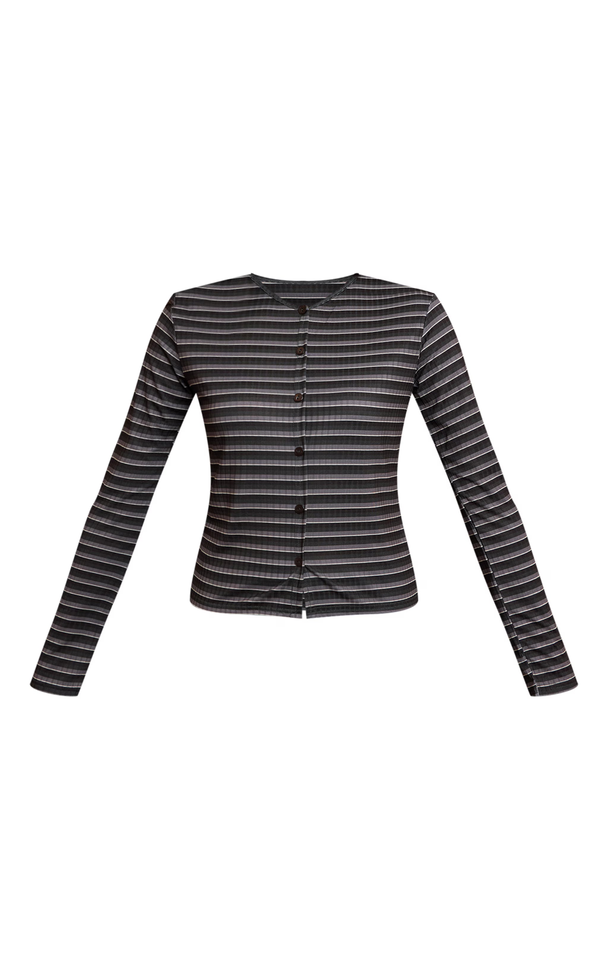 Command your everyday aesthetic with a piece that embodies understated confidence. The khaki stripe rib button down long sleeve top anchors your look with a distinctive ribbed texture and a striking horizontal stripe pattern, featuring a sleek round neckline and a full button-down fastening that extends into comfortable long sleeves, ensuring a polished yet effortless silhouette. For an elevated day ensemble, style this versatile top with a sharp tailored mini skirt or high-waisted denim. Ground your presence with the undeniable impact of black thigh high boots, then complete your refined look with minimalist accessories for a truly knowing statement.