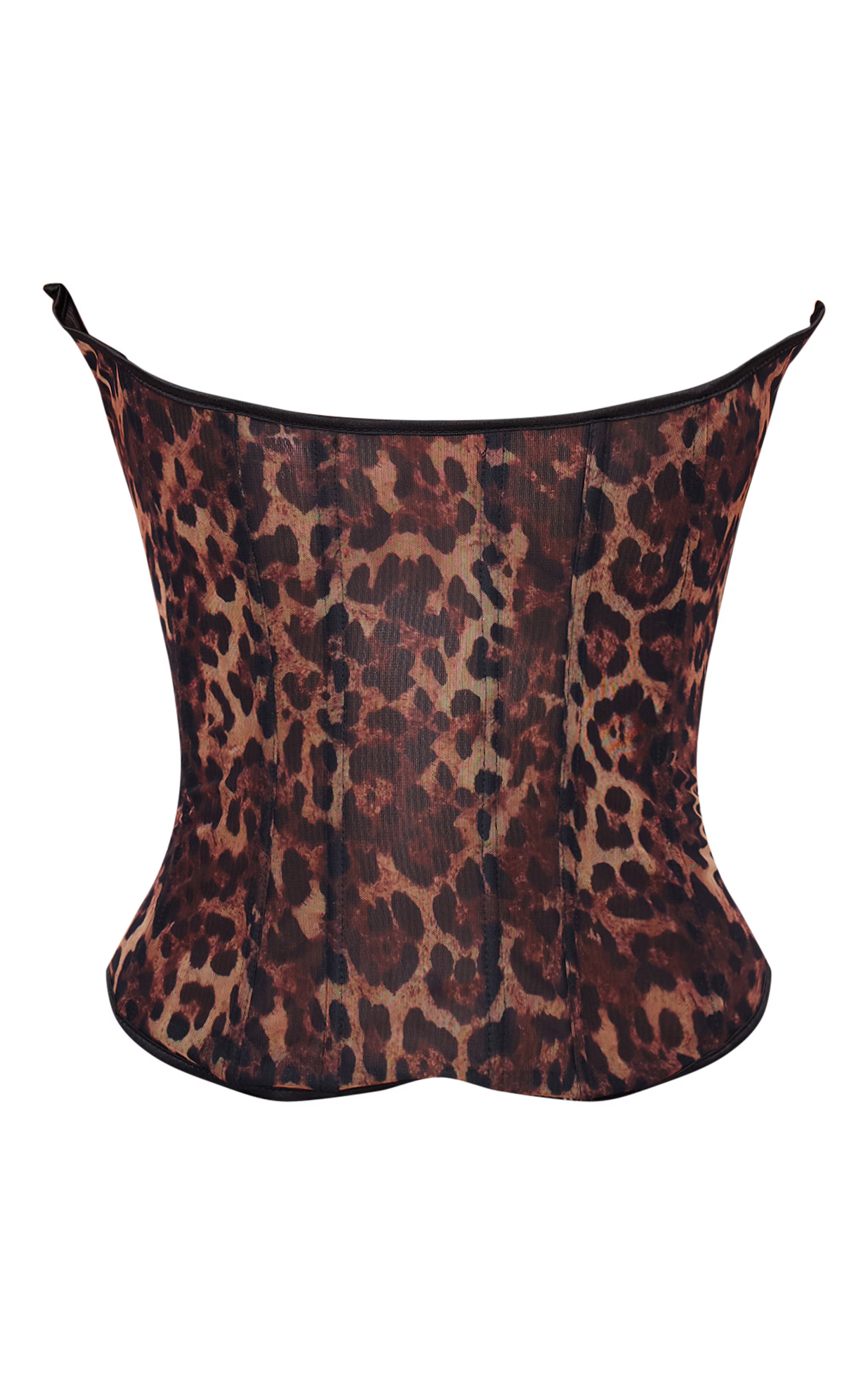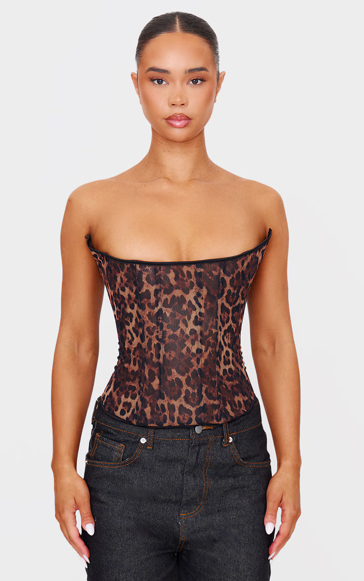 This leopard print mesh lace up detail bandeau corset is a fierce addition to your going-out wardrobe. Brought to you in a new season leopard print mesh, with a lace up detail and bandeau neckline, this corset will have you stealing all the stares. Pair with your best jeans and heels for a new go-to look.