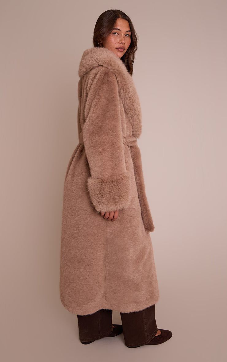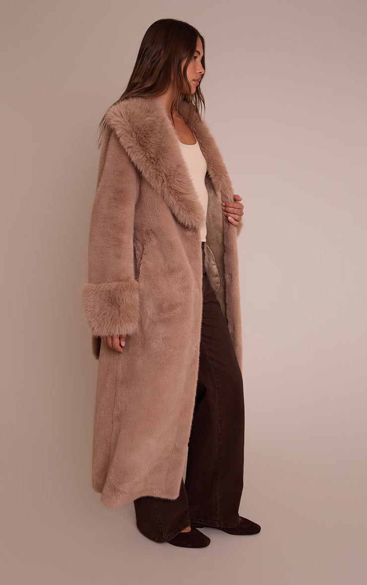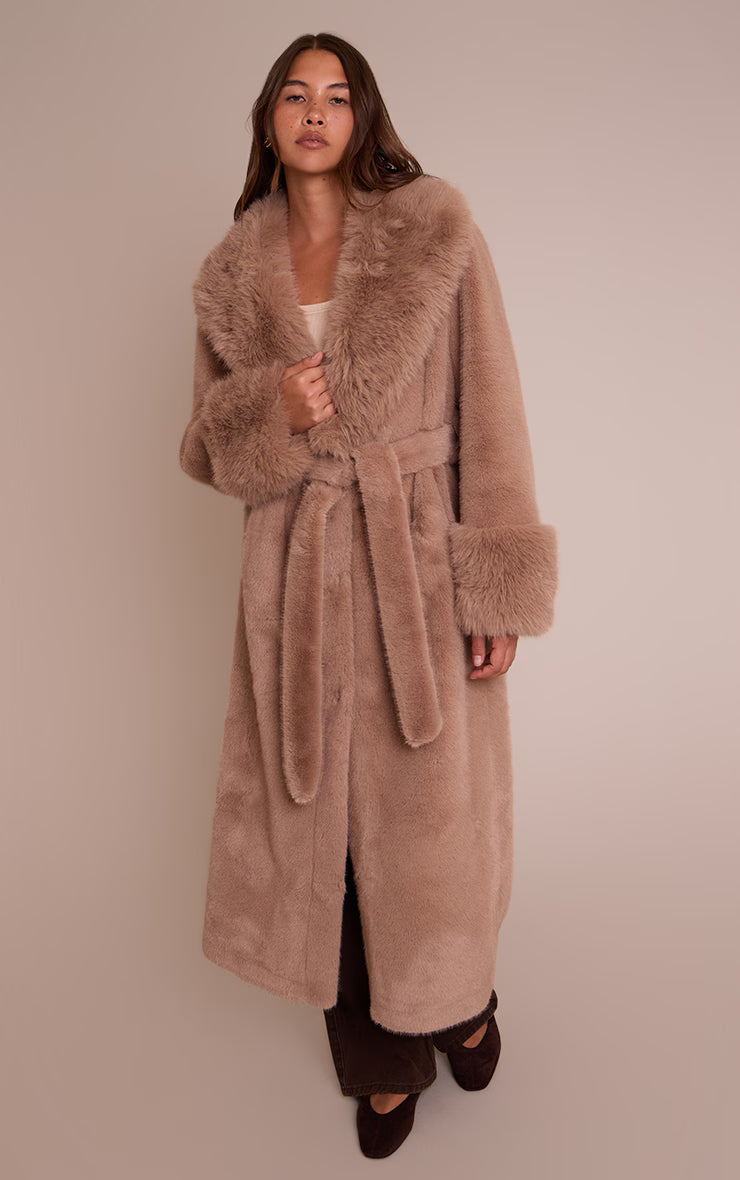 The mushroom faux fur self tie oversized coat is perfect for luxurious warmth and bold style. Its plush faux fur texture and self-tie belt create a relaxed yet polished silhouette. Pair with skinny jeans and boots for a chic winter outfit, or drape over a dress for added sophistication.