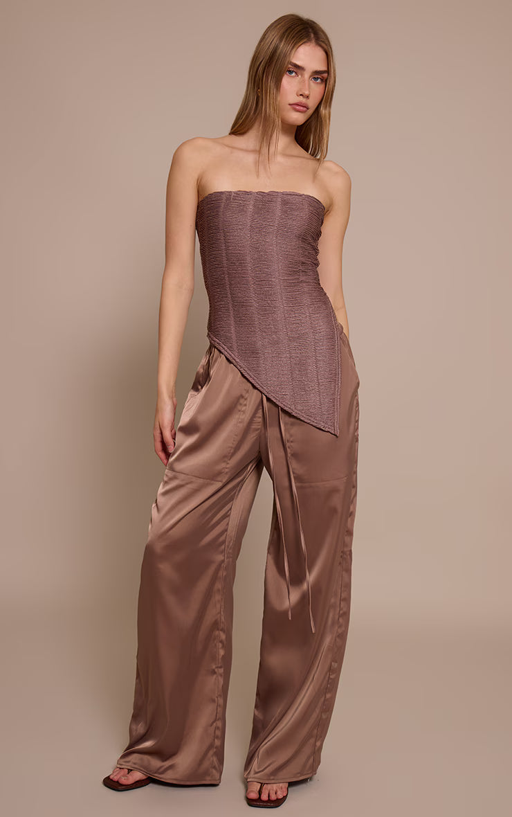 Switch up your look with the mushroom textured asymmetric hem bandeau top. Cut from mushroom textured jersey, this bandeau has an asymmetric hem for a flattering contemporary shape. Style with a matching mini skirt and sleek accessories for a coordinated vibe.